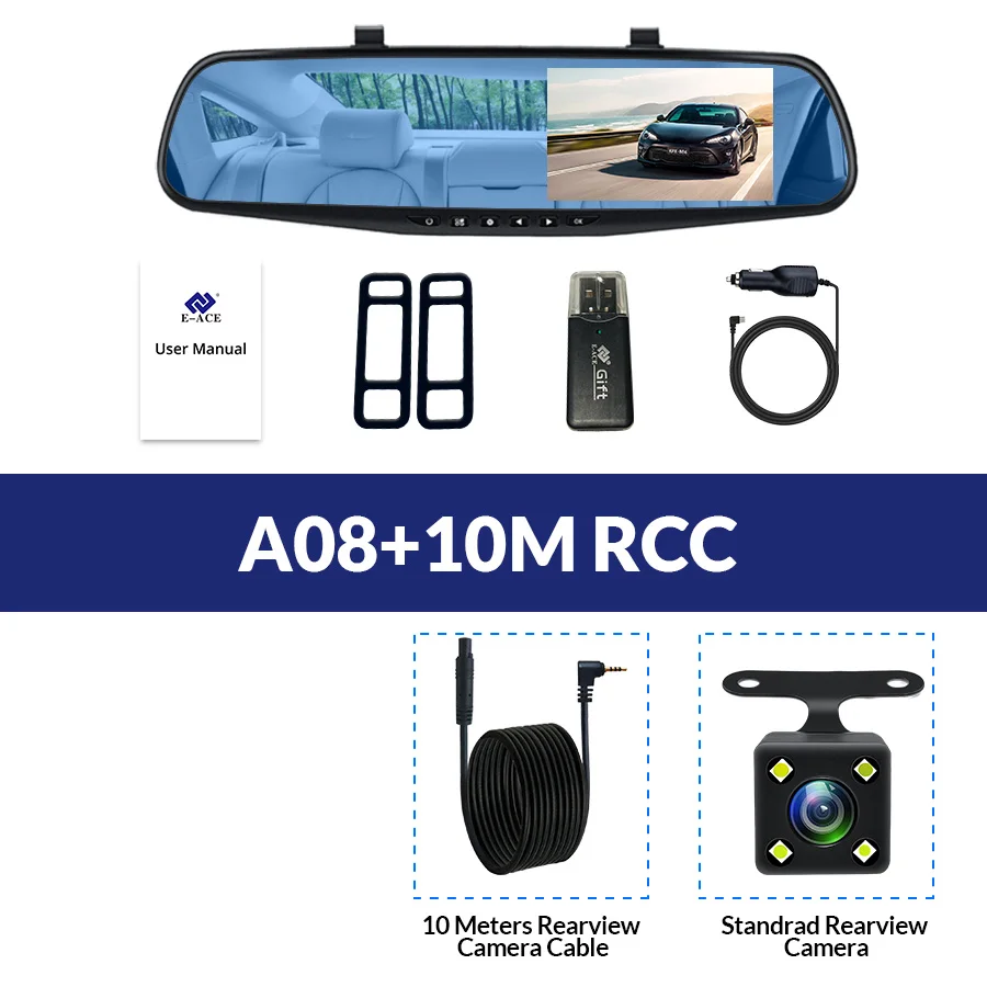 -1 x DVR -1 x Power charger -1 x User Manual -2 x Bandage -1 x USB Card Reader (Gift) -1 x Rearview Camera With 6 Meters Cable