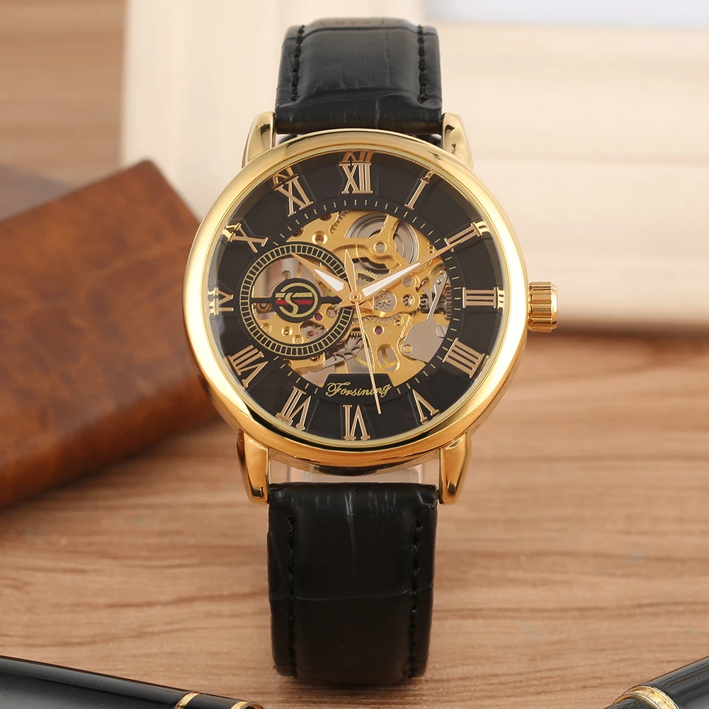 Роскошный внешний вид: Классический Золотой/серебристый футляр для часов и уникальный дизайн золотых римских цифр С Вырезанным циферблатом, премиальный черный кожаный ремешок с пряжкой делают его роскошным и изысканным.