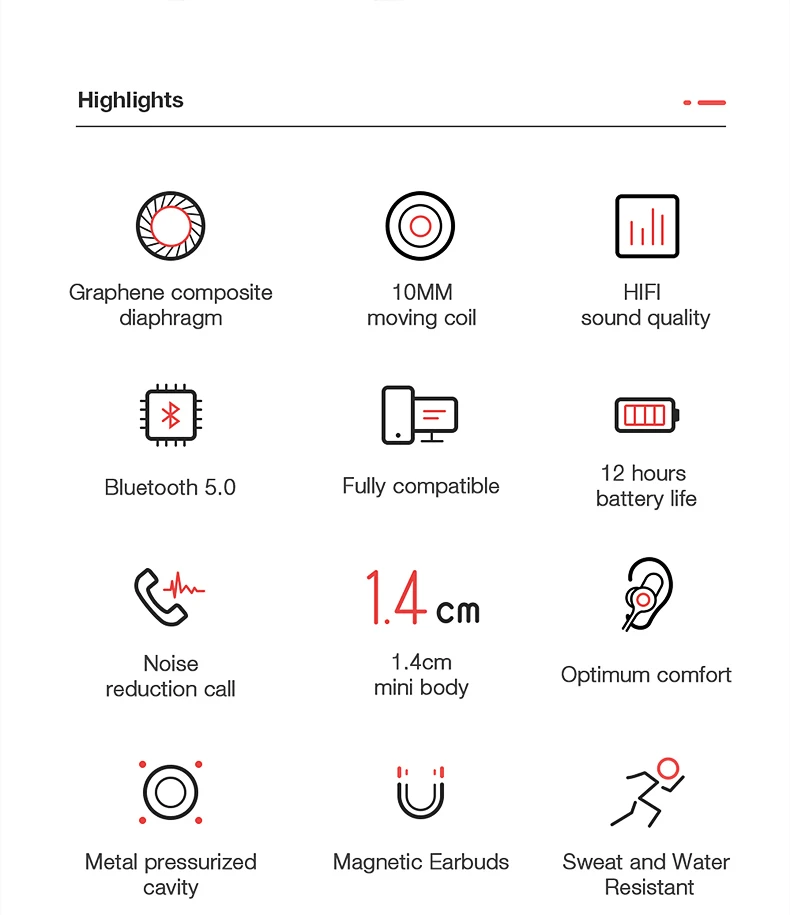 Композиционная графеновая диафрагма 10 мм подвижная катушка Hi-fi качество звука Bluetooth 5,0 Полностью совместимый 12 часов работы от аккумулятора Подавление шума вызова 1,4 см мини-корпус Оптимального комфорта Металл под давлением, изготовленные на станке Магнитные наушники Защита от пота и водонепроницаемость