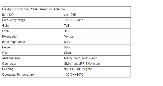 SMA male 4G телескопическая антенна 5 секций 7dbi omni Lte wifi антенна Lte 4g gsm wifi omni SMA телескопическая антенна Пункт NO. xls-1065 Частотный диапазон 700-2700 МГц Получить 7dBi КСВ ≤ 1,8 Поляризация: вертикальная Вход импеданс 50Ω Мощность 50 Вт Цвет серебро Размер антенны max500мм, min122мм Разъем SMA male /RP-SMA male Изгиб 90 ~ 135 ~ 180 градусов Рабочая температура-35 °C ~ + 80 °C