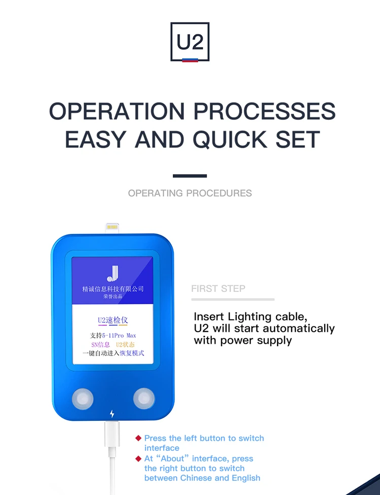 Технические характеристики JC U2 устройство для идентификации Tristar для iPhone/ iPad U2 зарядное устройство IC и SN Самый простой способ определить статус вашего чипа iPhone/iPad U2 и прочитать SN. Теперь вам просто нужно подключить JC U2 к вашему iPhone/iPad, статус чипа U2 и SN будут отображаться в считанные секунды, идеальные инструменты для ремонта зарядных устройств и идентификации iPhone. Операций, Шаг 1, подключите ваш JC U2 через usb-кабель освещения для включения Шаг 2 Нажмите кнопку правой функции, чтобы выбрать язык (язык доступен только при включении JC U2) Шаг 3. Подключите ваш iPhone/iPad к JC U2 через кабель для подключения данных Шаг 4, опционально для вас, чтобы нажать левую функциональную кнопку для переключения вертикального или горизонтального дисплея Шаг 5, проверьте Доступные данные чипа U2 (Tristar) и SN, состояние показывает как NG или OK для каждого результата тестирования. Опционально для вас, чтобы нажать кнопку правой функции для запуска тестирования снова.