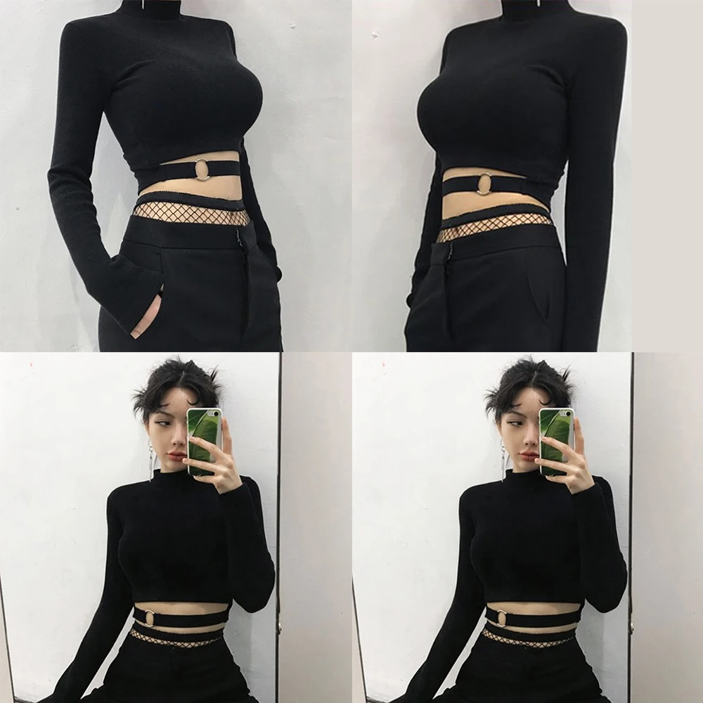 Женская облегающая футболка с высоким воротником, укороченный однотонный черный клубный топ с длинными рукавами, уличная одежда, осень-зима, Harajuku