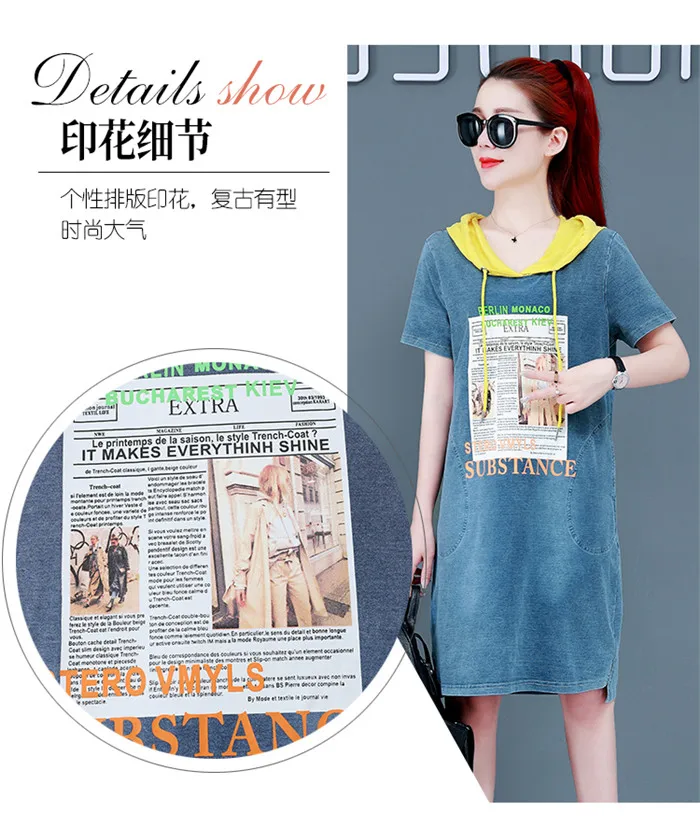 2019 Новое Женское летнее платье с капюшоном джинсовое свободное платье с принтом диагональная летняя футболка с карманом Джинсы женские Vestido повседневные горячие продажи 960