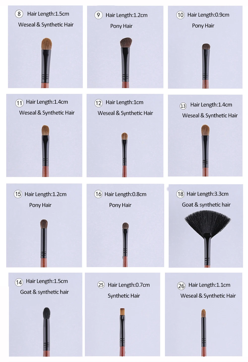 #8 кисть для консилера (длина волос: 1,5 см Общая длина: 17,5 см) #9 Средний Угловой шейдер (длина волос: 1,2 см Общая длина: 17,1 см) #10 Дымчатая кисть шейдер (длина волос: 0,9 см Общая длина: 17 см) #11 тени для глаз (длина волос: 1,4 см Общая длина: 17,4 см) #12 маленькая кисть для теней (длина волос: 1 см Общая длина: 16,6 см) #13 средняя кисть для теней (длина волос: 1,4 см Общая длина: 17,5 см) #14 средняя кисть для растушевки (длина волос: 1,5 см Общая длина: 17,5 см) #15 точечные шейдеры (длина волос: 1,2 см Общая длина: 17,2 см) #16 маленькая кисть-шейдер (длина волос: 0,8 см Общая длина: 16,4 см) #17 сгибание кисти (длина волос: 1 см Общая длина: 16,4 см) #18 маленькая Веерная щетка (длина волос: 3,3 см Общая длина: 18,8 см)