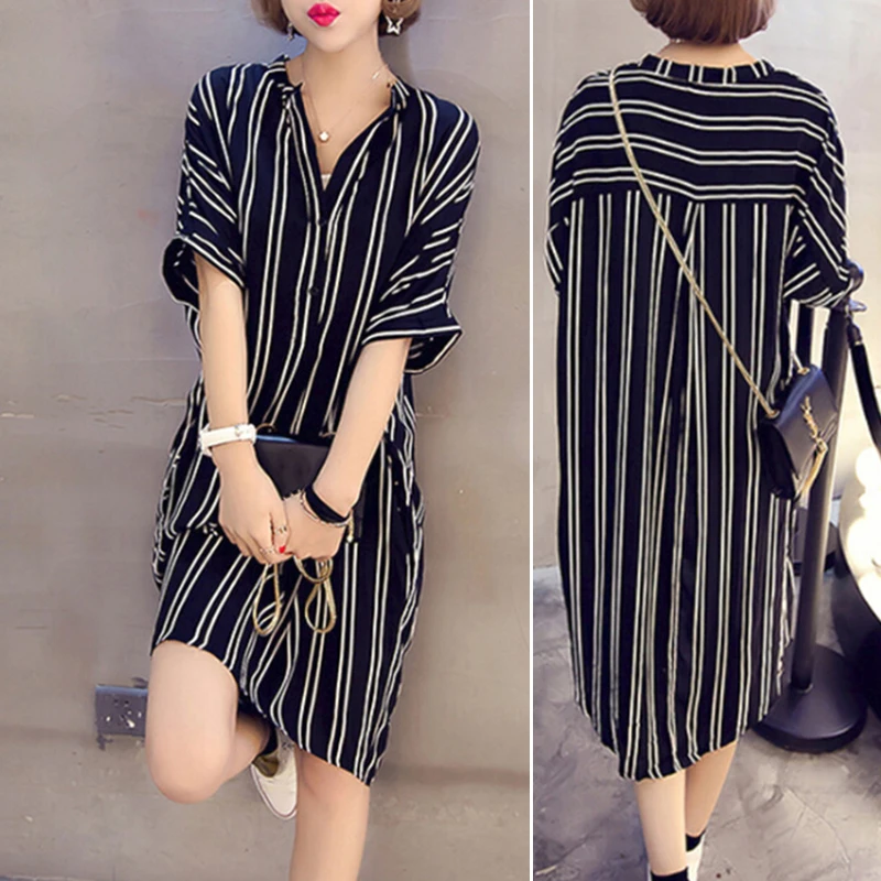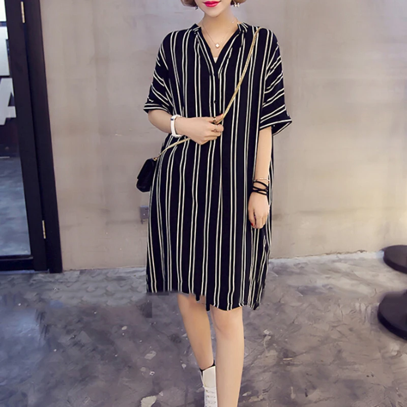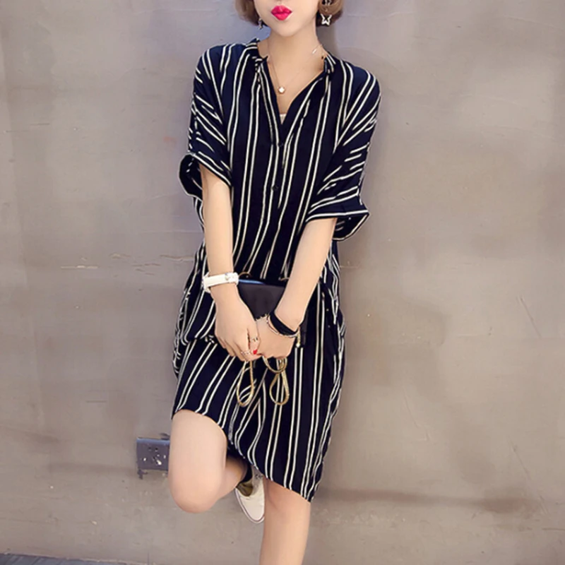 * Описание товара: Новый Для женщин Повседневное свободная, с коротким рукавом платье-рубашка в полоску с v-образным вырезом платье Большие размеры
