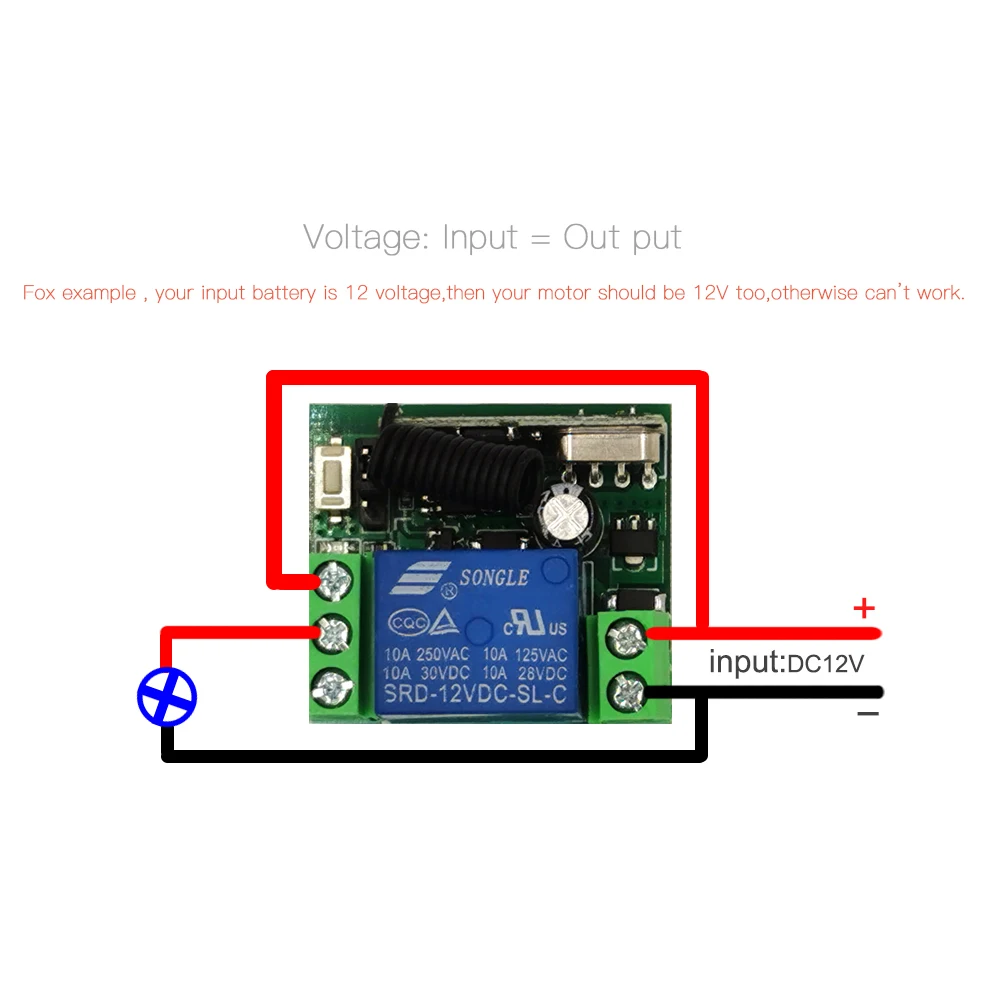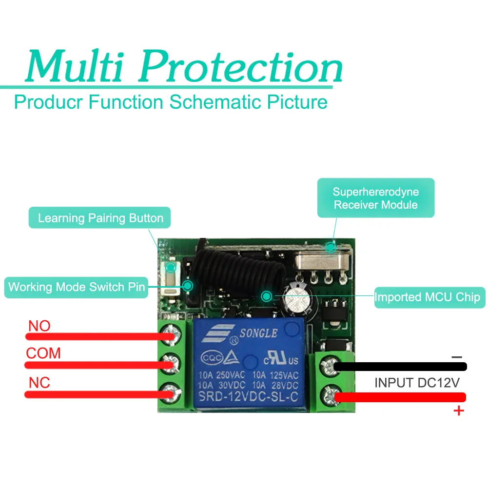 Входная мощность: DC10V-14V Ток в режиме ожидания:<5 мА Частота RF: 433 м Режим работы RF: супергетеродинный Чувствительность приема: >98dbm Расстояние передачи:>100 м (открытое пространство) Режим декодирования: Программное обеспечение MCU декодирование Удаленное Хранение: 30 шт. Поддержка удаленного типа: Обучающий код, фиксированный код Режим работы: Мгновенный, тумблер, фиксация Тип проводки: стационарный терминал Выходной терминал: нет, NC , COM