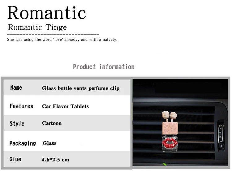 Название продукта: стеклянный флакон с отверстиями для духов Тип зажима: Автомобильные ароматизаторы Стиль: мультфильм материал: стекло размер: 4,6*2,5 см Примечание: В флаконе нет духов, это пустой флакон. Может содержать 8 мл духов. Зажим выхода воздуха вращается на 360 градусов, а Горизонтальные и вертикальные отверстия воздуха применимы! Колпачок не должен плотно затягиваться. Если оно затянуто, верните 1/4, чтобы не вызвать трещину во рту бутылки, вызванную чрезмерным давлением, но также способствует более качественному аромату.