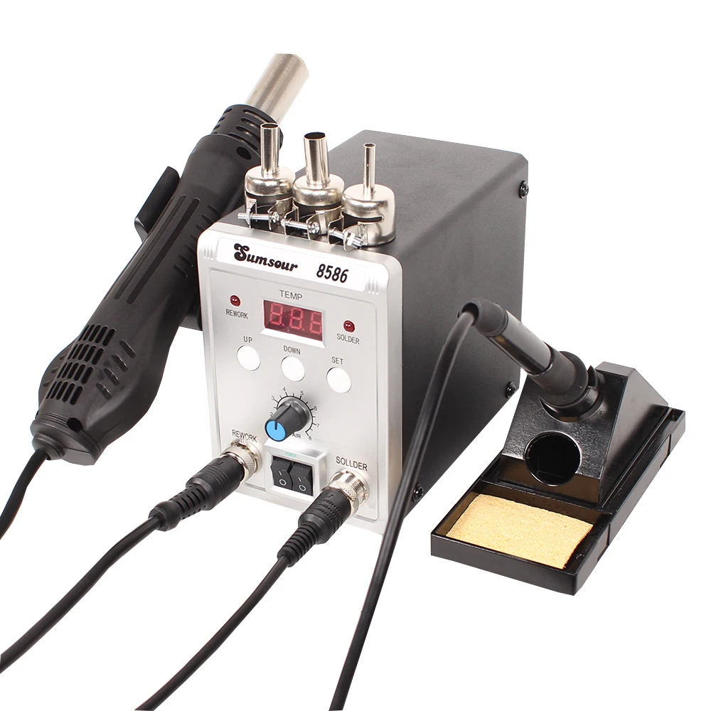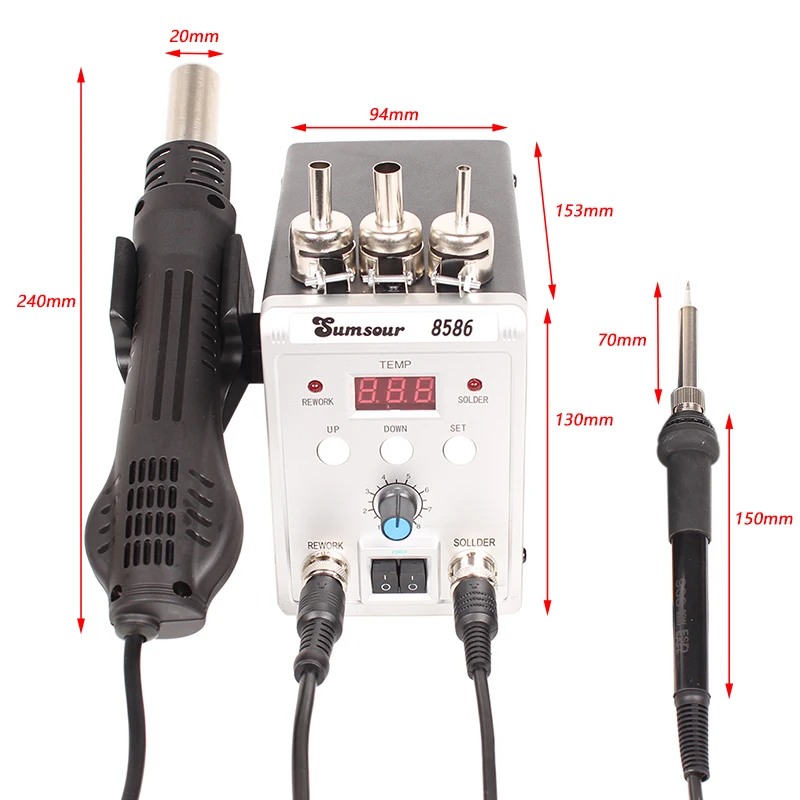 Это совершенно новая паяльная станция 2 в 1 SMD 8586. Металлический корпус из сплава с высококачественным силиконовым корпусом отличается элегантным внешним видом и энергосбережением. Вы можете использовать пистолет горячего воздуха и паяльник отдельно, без помех друг с другом. Из-за ручки с сенсорным переключателем система может быстро получить доступ к режиму работы во время захвата ручки. В то же время система перейдет в режим ожидания во время выхода ручки. Особенно подходит для монтажа и повторной работы SMD компонентов вручную. Действительно должно быть!
