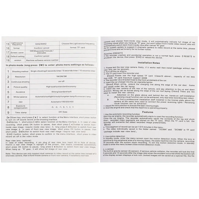* 3 объектива камеры: оснащен фронтальным обзором, автомобильным внутренним обзором и задним обзором. При реверсе видеорегистратор автоматически переключается для отображения изображения заднего объектива, а полный экран отображает заднюю среду, поддерживающую Реверсивный режим.