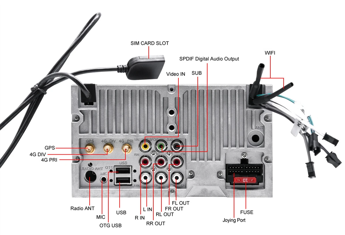 1) видеовыход 2) Оригинальная Заводская камера заднего вида 3)DVD/CD слот 4)iPod 5) Оригинальная Автомобильная GPS антенна 6) Оригинальная Автомобильная камера заднего вида 7) Оригинальная Автомобильная Bluetooth 8) оригинальный Автомобильный USB 9) оригинальный автомобильный микрофон 10) слот для карты TF/Micro SD