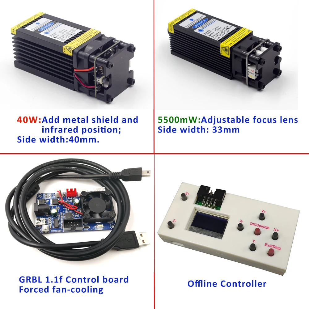 1,5500 mW лазер является регулируемым объективом для фокусировки, подходящая длина фокусировки составляет 6-7 см, он может гравировать на дереве, фанере, бамбуке, коже, черном акриле, пластике, резине и т. д. Он также может отрезать около 2 мм углеродную доску и деревянную доску; 2. 40 Вт лазер фиксируется на 18 мм фокусе, гравирует гораздо быстрее, большая мощность, он может гравировать на нержавеющей стали легко и быстро, а также подходит для некоторых других металлических печати, он может отрезать около 3-4 мм древесины, кожи, черного акрила и т. Д.