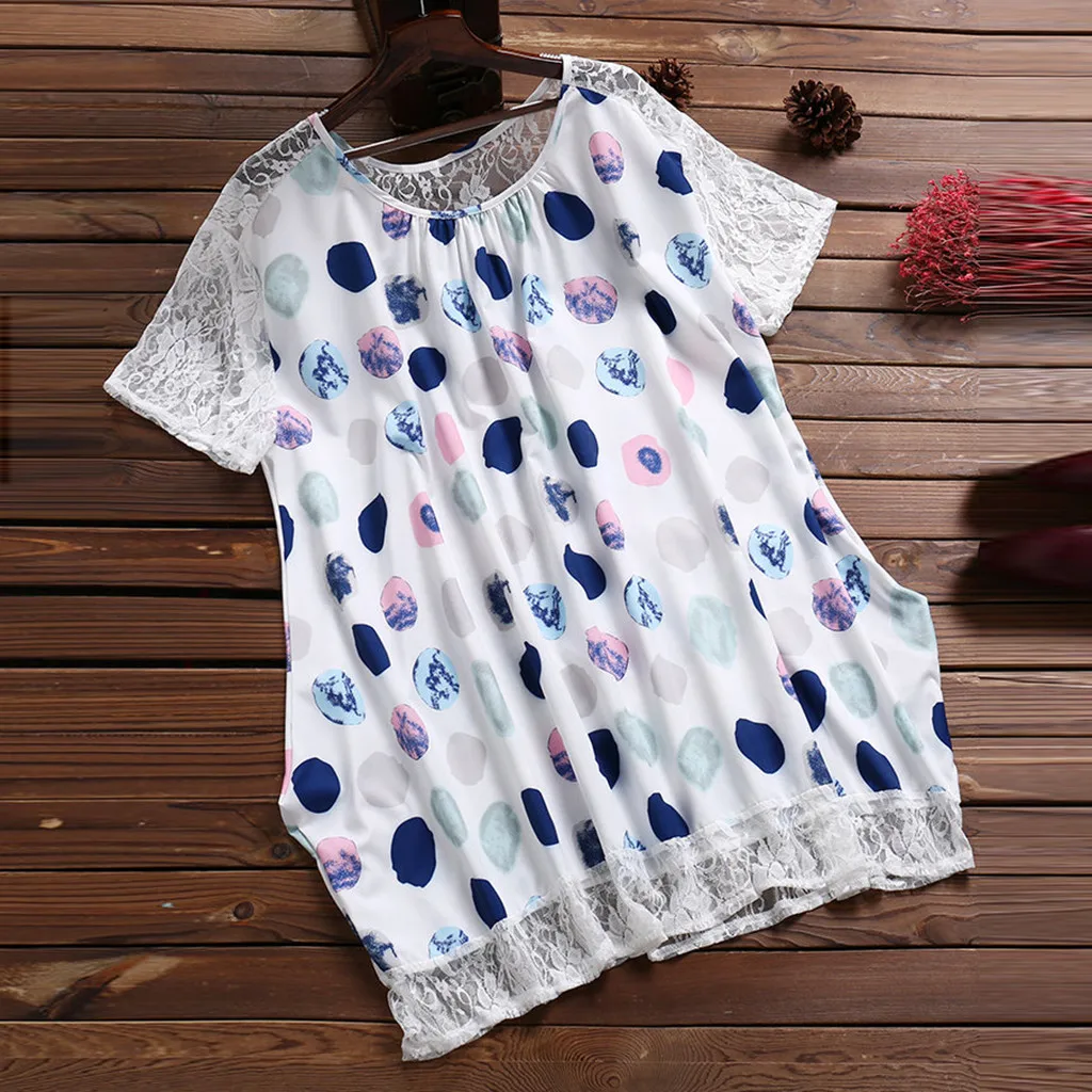 Женская Сексуальная рубашка в горошек с коротким рукавом, кружевная Лоскутная рубашка, пуловер, топы