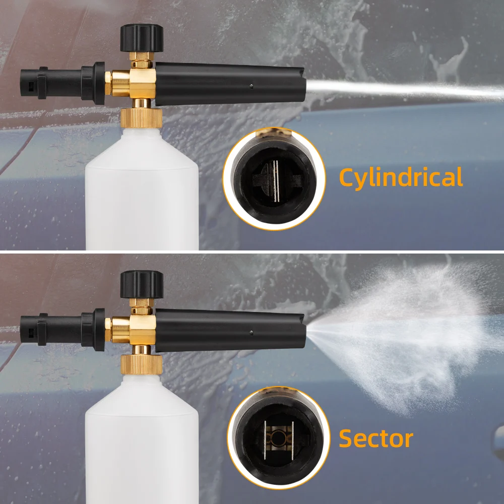 -Простота в эксплуатации, использование для подъездных дорожек, крыш, сайдинга, автомобилей, грузовиков, внедорожников -Экономит воду, безсенсорная Автомойка, экономит ваше время и энергию. -Работает с любыми мойками высокого давления -Производительность вспенивания: обильная, толстая и высокоплотная пена, сверхпрочная и прочная конструкция -Регулируемое сопло пены, может форму типа пены свободно