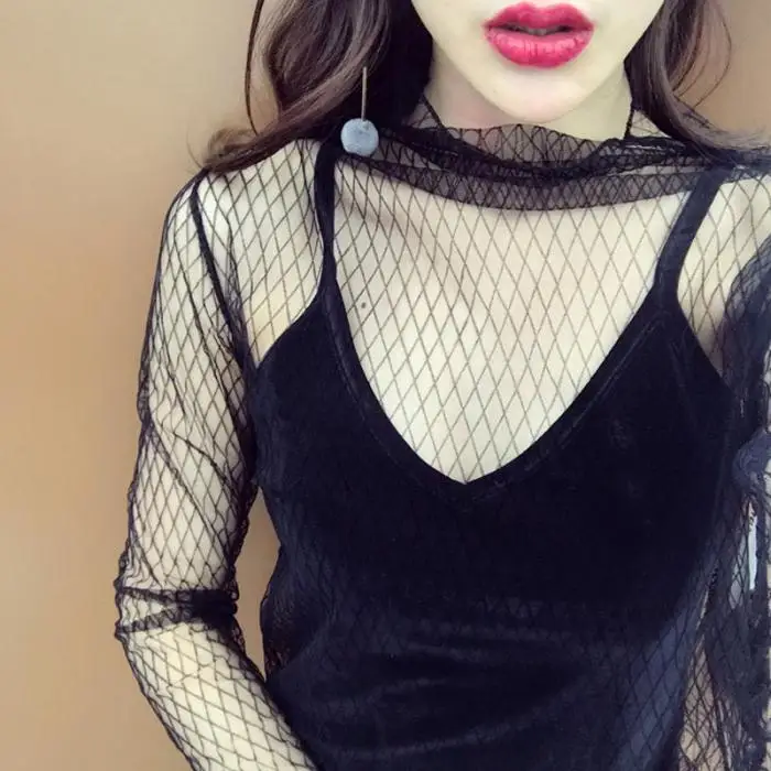 Тип одежды: Сексуальная женская прозрачная сетчатая блузка с длинными рукавами; прозрачная блузка; топы; футболка