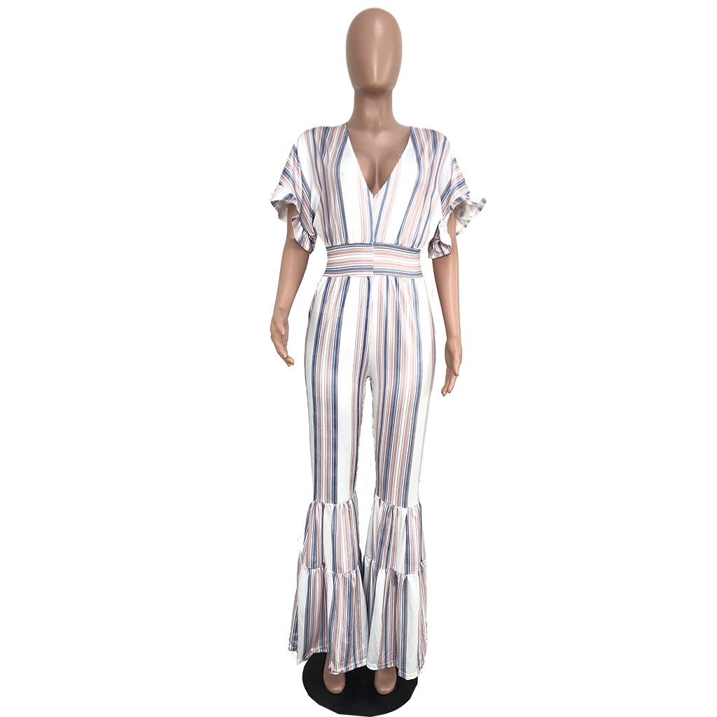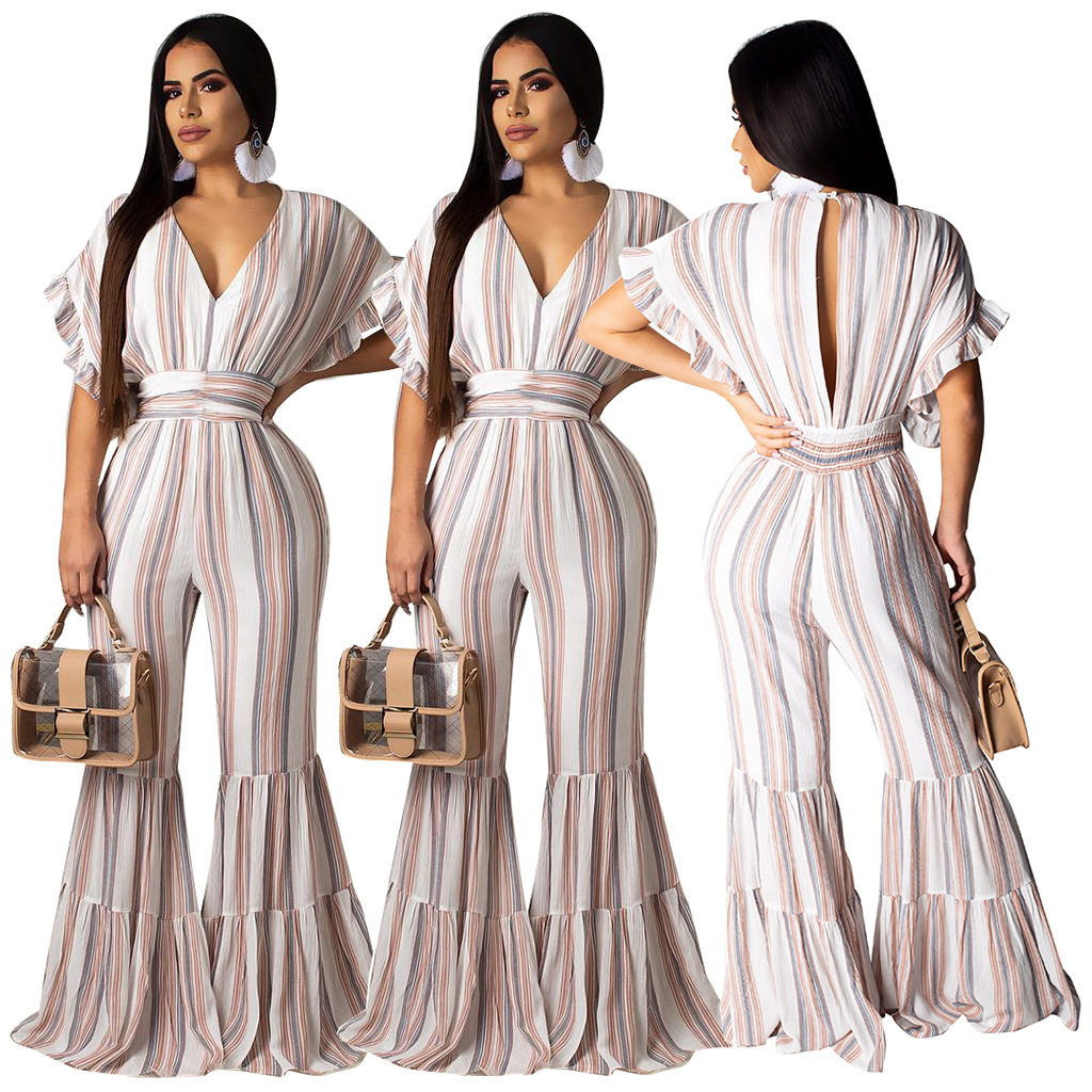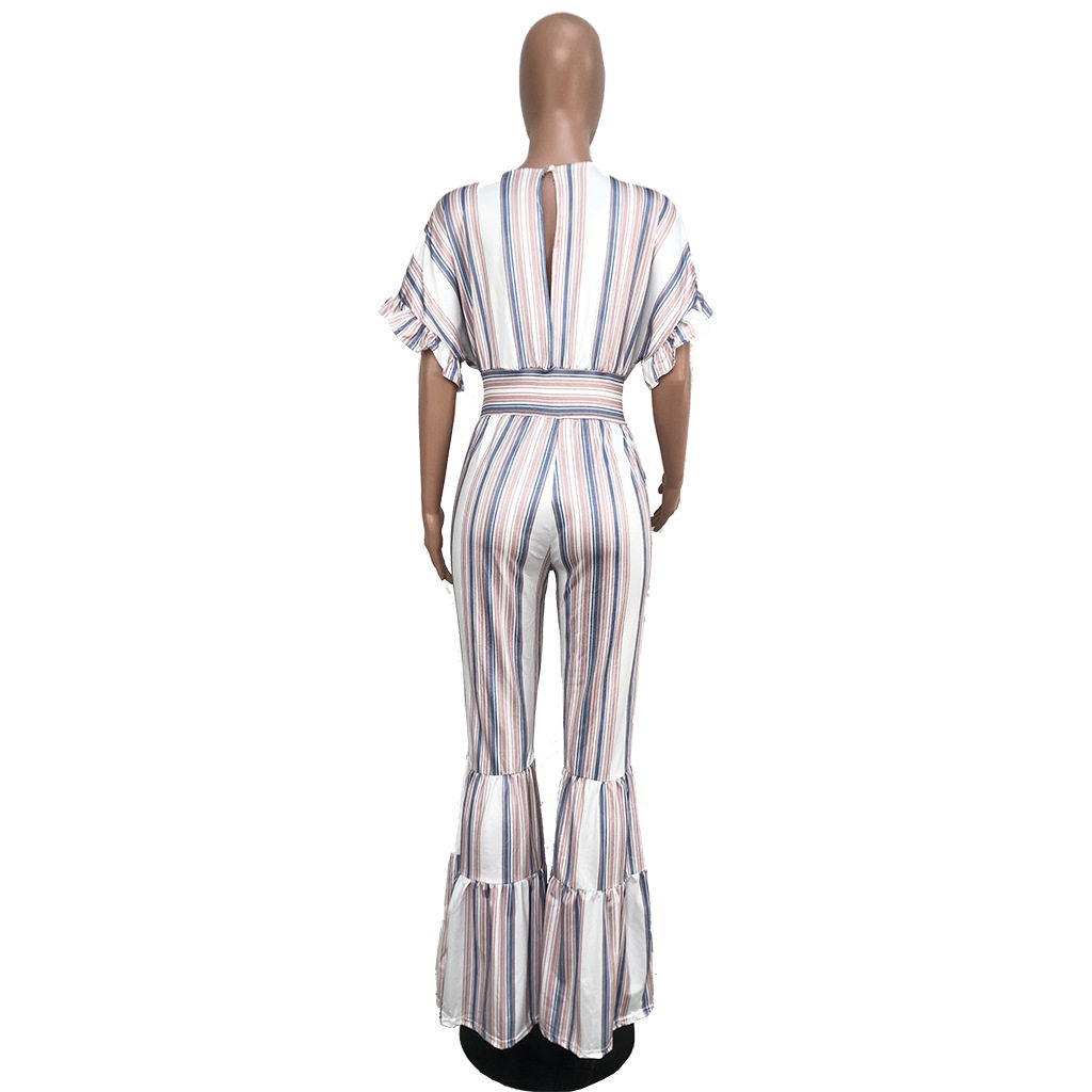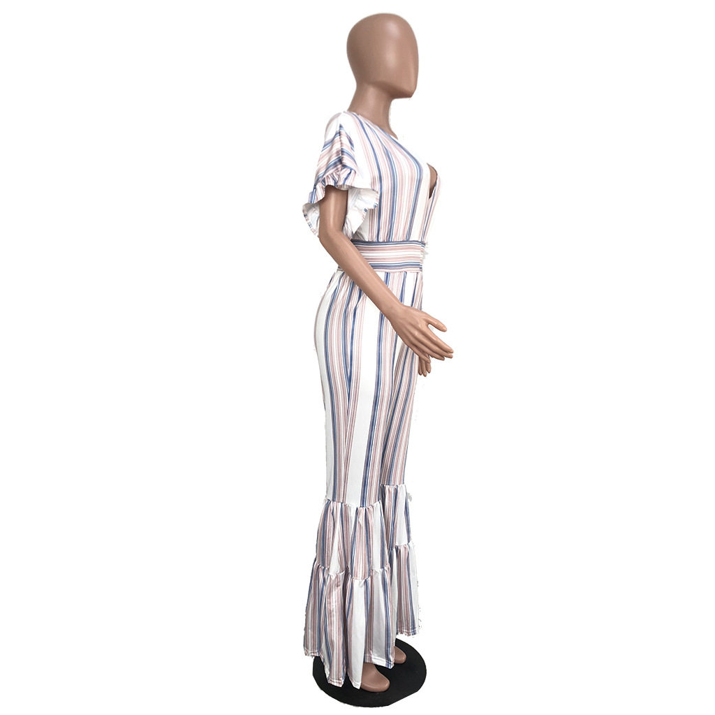 Женские обтягивающие сексуальные комбинезоны в полоску с глубоким v-образным вырезом, коротким рукавом и оборками, Летний Пляжный комбинезон с открытой спиной, AE231