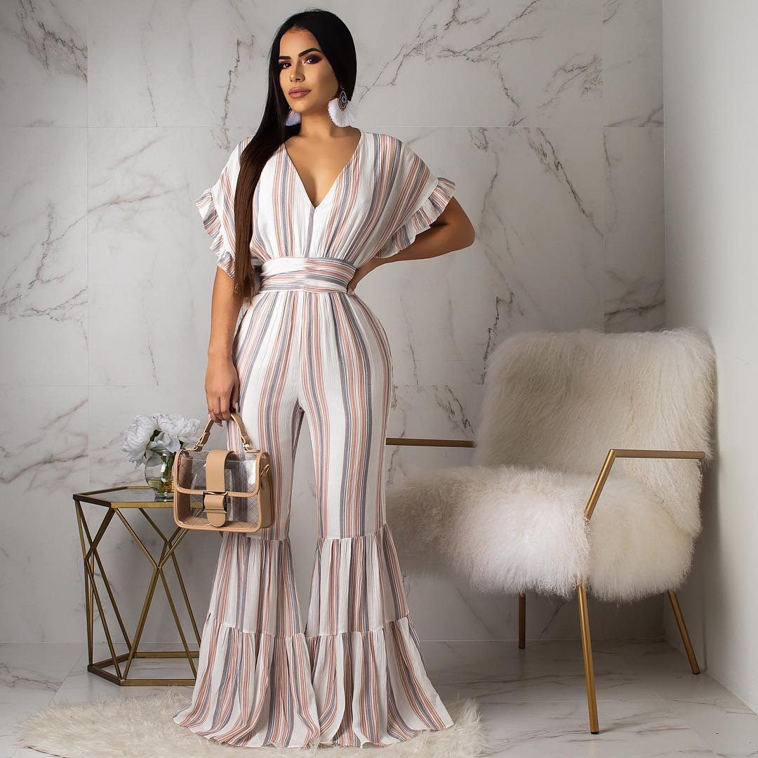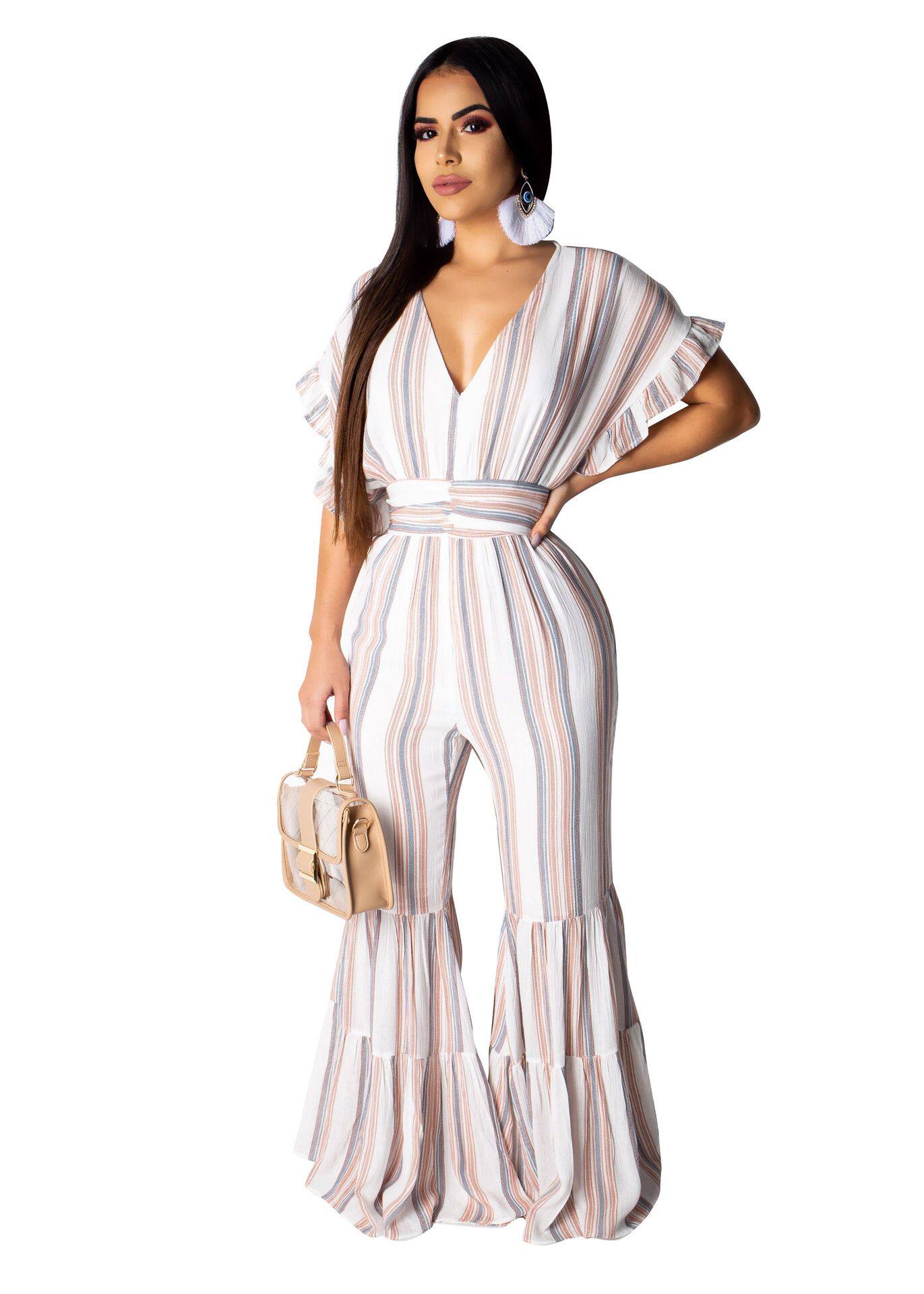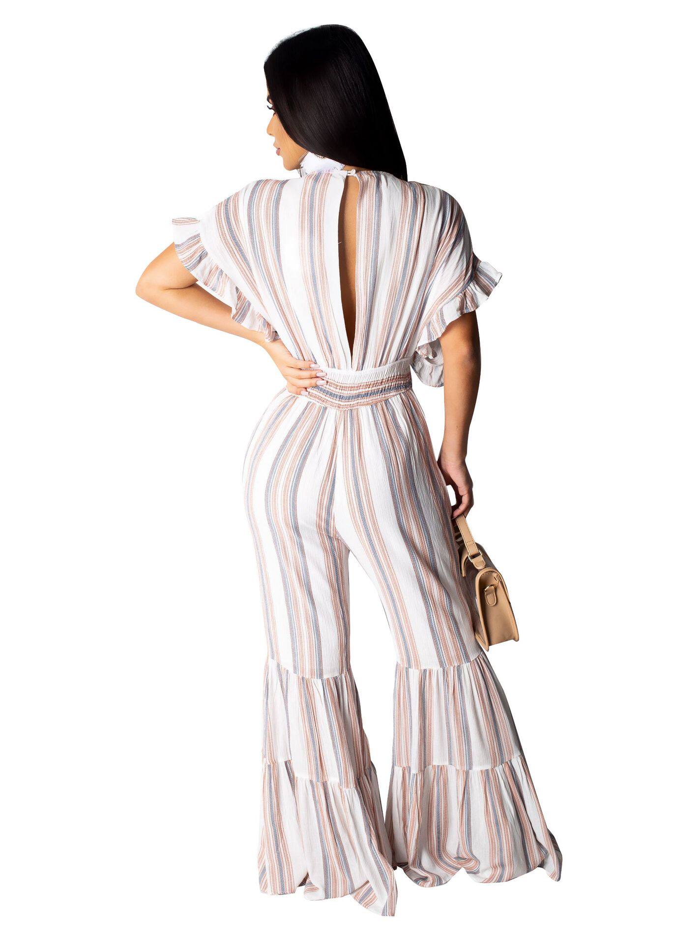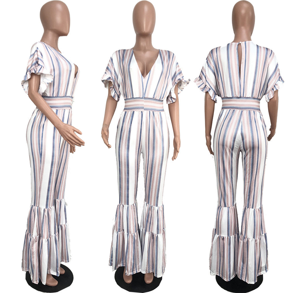 Женские обтягивающие сексуальные комбинезоны в полоску с глубоким v-образным вырезом, коротким рукавом и оборками, Летний Пляжный комбинезон с открытой спиной, AE231