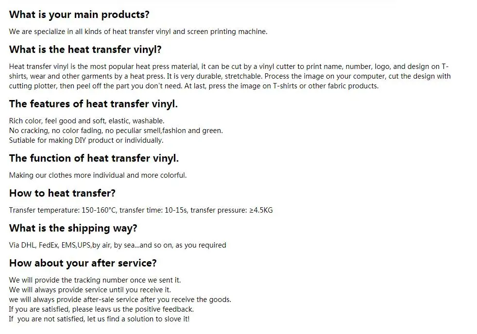 150-160 градусов, 5-10 секунд, горячая или теплая кожура. Характеристики продукта: 1. Насыщенный цвет, приятный на ощупь и мягкий, эластичный, моющийся 2. Нет трещин, нет выцветания, нет специфического запаха, модный и зеленый 3. Подходит для изготовления самостоятельного продукта или индивидуального дизайна. ПУ теплопередающая пленка/винил является самым популярным печатным материалом в настоящее время. Он может быть использован для печати любых узоров дизайна с помощью термопереводной машины, таких как имя, номер, логотип и любой дизайн одежды. Инструкция: 1. Поместите пленку теплопередачи/винил на резную машину и Отрегулируйте давление и скорость; 2. Выберите изображение, которое вы хотите напечатать на компьютере, и выберите зеркальное изображение, а затем нажмите на кнопку гравировки; 3. Вырежьте Резные узоры из пленки и Оторвите части, которые вам не нужны, картинка готова к использованию; 4. Поместите Резные узоры на одежду. Печать изображения с помощью машины передачи тепла с температурой 150 ℃ в течение 10 секунд, и снимите прозрачную защитную пленку сразу, затем изображение было передано на одежду. Эти инструкции могут отличаться в зависимости от машины передачи, используемой для применения. Может потребоваться разница во времени, давлении и/или температуре. Настоятельно рекомендуется правильное тестирование.