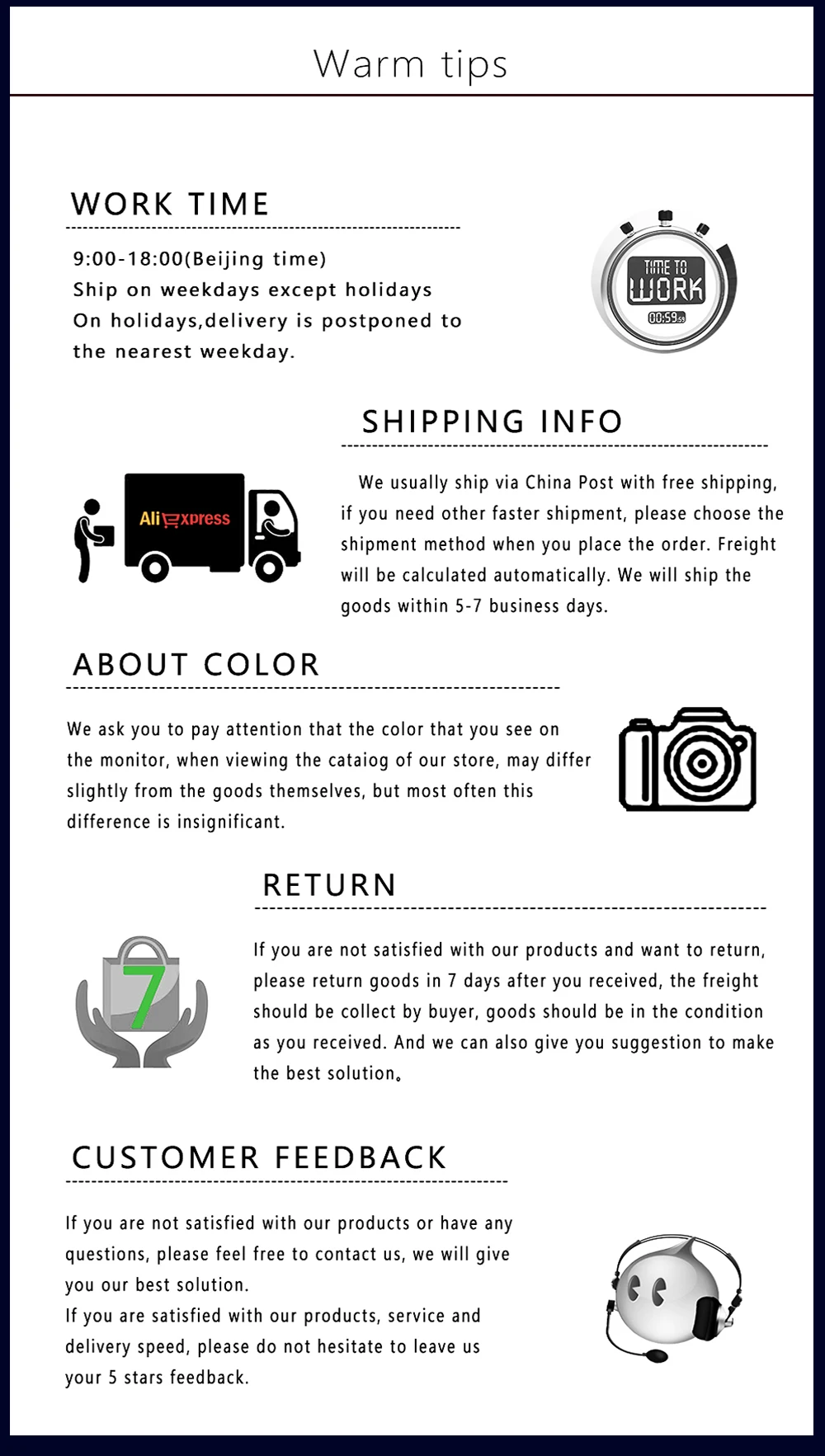 К покупателям В1: Оптовая продажа или дропшиппинг проводится ли у вас ? Для оптовой продажи мы представим дополнительную скидку или бесплатную экспресс-доставку. Для дропшиппинг мы сможем отправить товар напрямую вашим клиентам и без нашей информации способом доставки, который вы выбрали. В2: Как я могу отследить свою посылку? Вы можете проверить ваш номер трека на следующем веб-сайте. //t.17track.net //global.cainiao.com В3: Что я могу делать, когда время защиты заказа истечет? Если время защиты истечет, пожалуйста, свяжитесь с нами, и мы можем помочь вам продлить его. Так что ваши деньги не поступят на наш счет, а еще остаются на платформе Алиэкспресс.