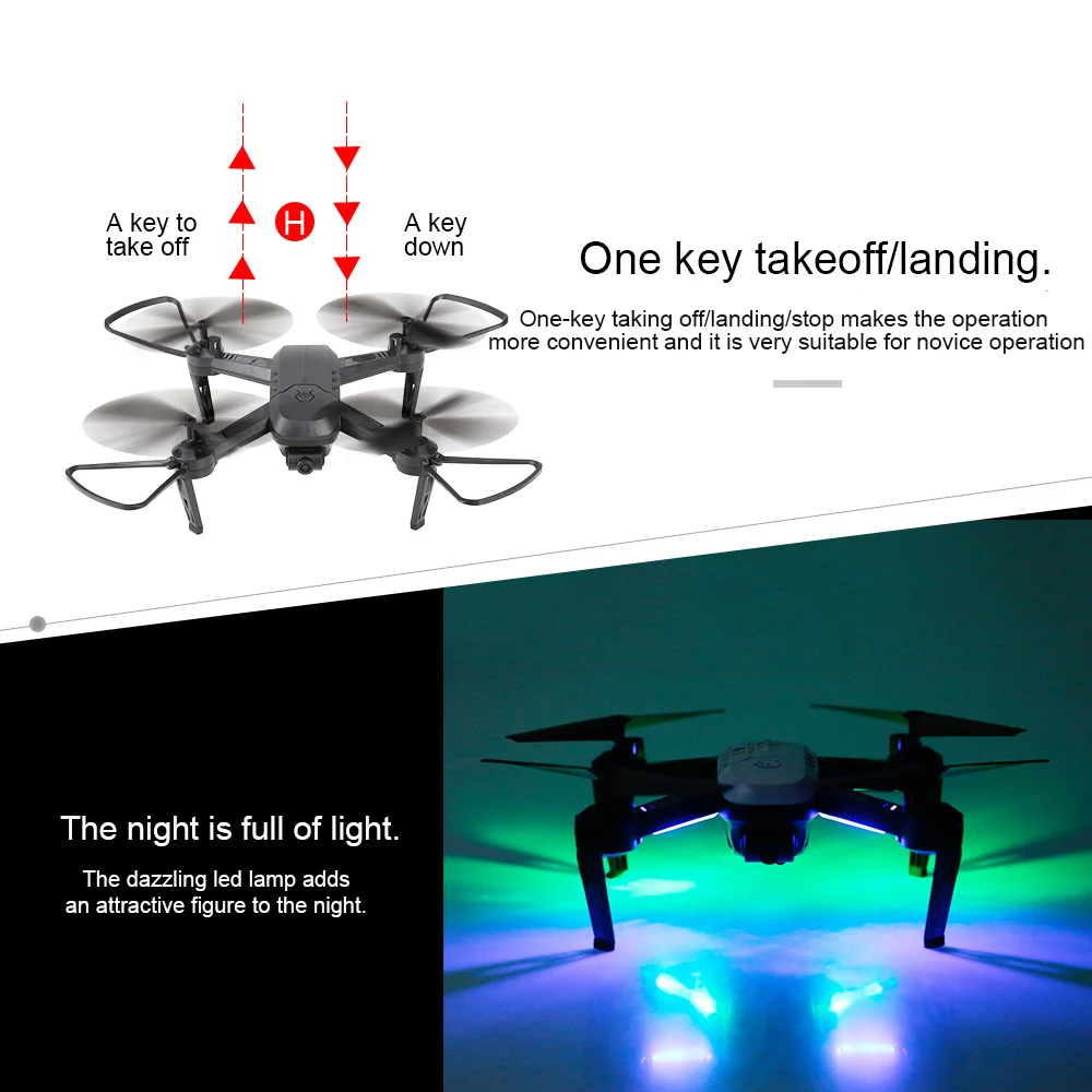 Особенности:18 минут летного времени, который идеально подходит для rc фанатовРежим скорости H/L и функция 3D eversion для вас, чтобы испытать крутую летающую игру.2,4G 4CH передатчик и 6-осевой гироскоп для вашего легкого и стабильного управления.Холодный светодиодный свет может четко определить направление в ночное время, увеличить больше удовольствия.С привлекательным безголовым режимом, полностью решая проблемы с потерей ориентировки.Режим удержания высоты облегчает управление дроном для начинающих.Один ключ Взлет/посадка/остановка делает работу более удобной и очень подходит для начинающих операций.С помощью одной функции автоматического возврата самолет может легко найти путь домой.