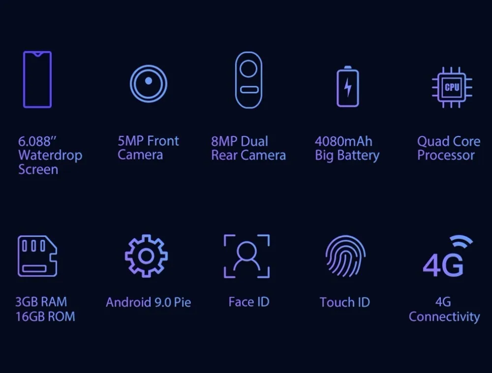 | ОС:Android 9,0 Pie | ЦП:MT6761V/WBЧетырехъядерный процессор2,0 ГГц | ||||