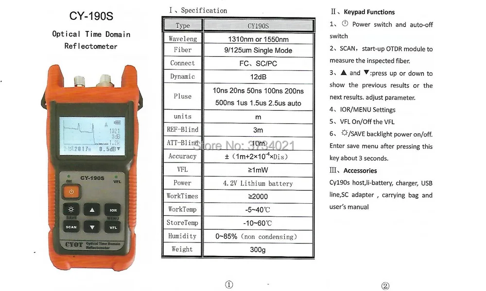 Бесплатная доставка OTDR CY-190S оптический временной домен рефлектометр SM 60KM 1310nm + 1mW VFL волоконно-оптический тестер