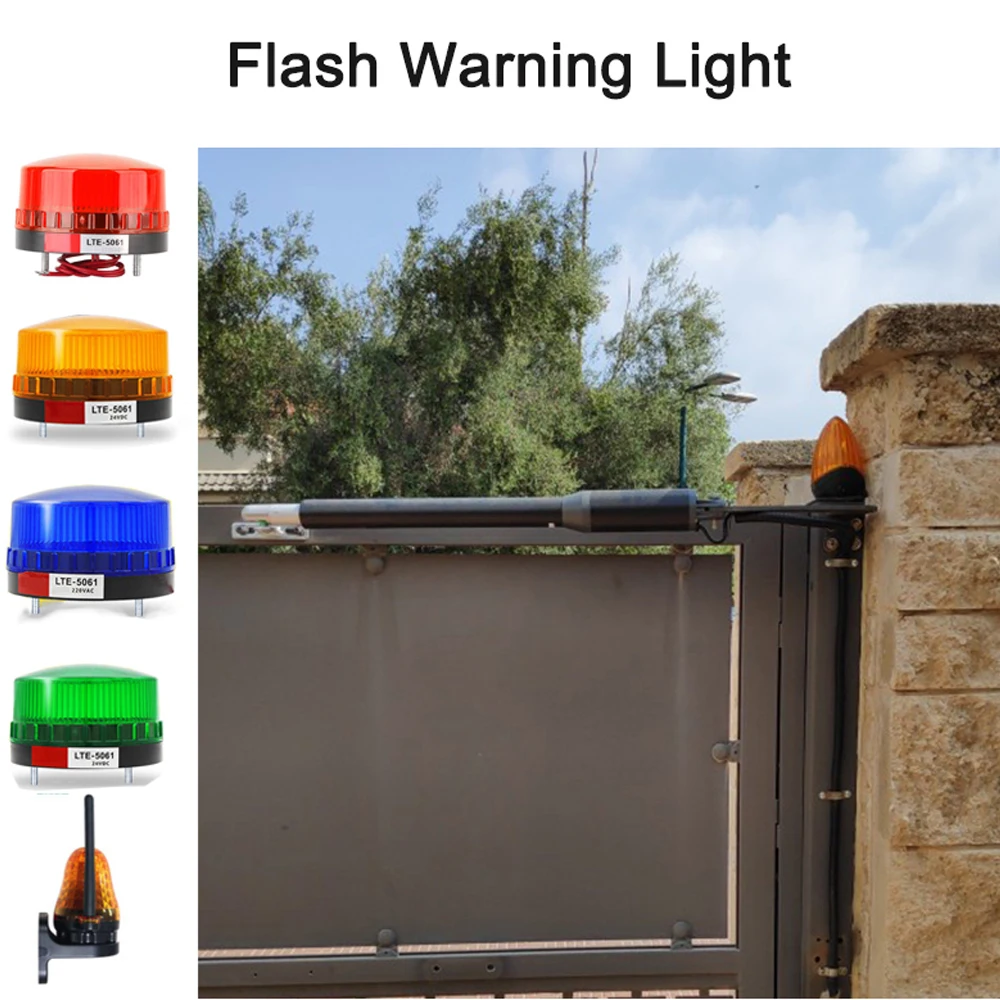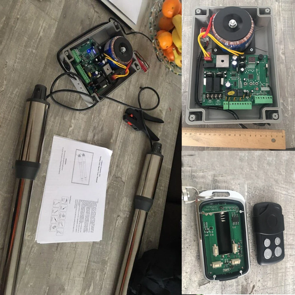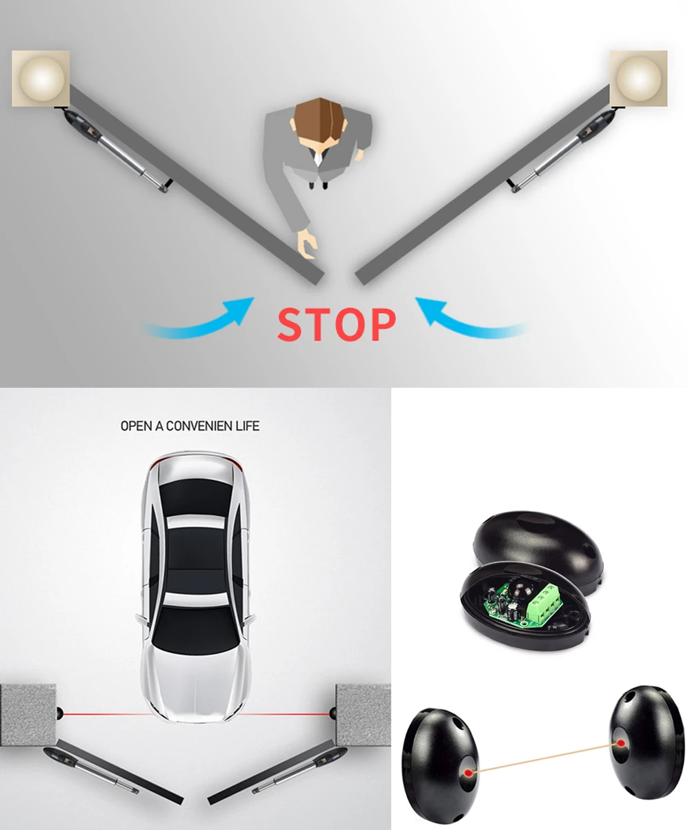 Комплект 4: 1 полный комплект открывалка для распашных ворот с 2 * пультами дистанционного управления, 1 * пара фотоэлементов, 1 * светильник для вспышки, 1 * солнечные панели