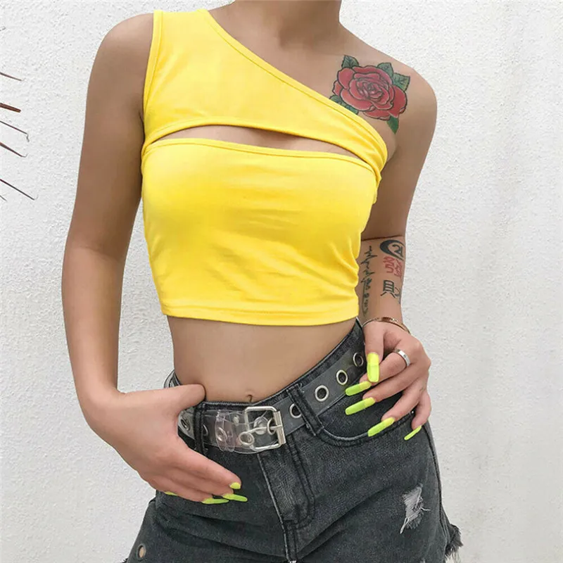 Женские открытые топы, новые желтые топы на одно плечо, женские модные летние топы без рукавов, короткий тонкий Топ, хит продаж