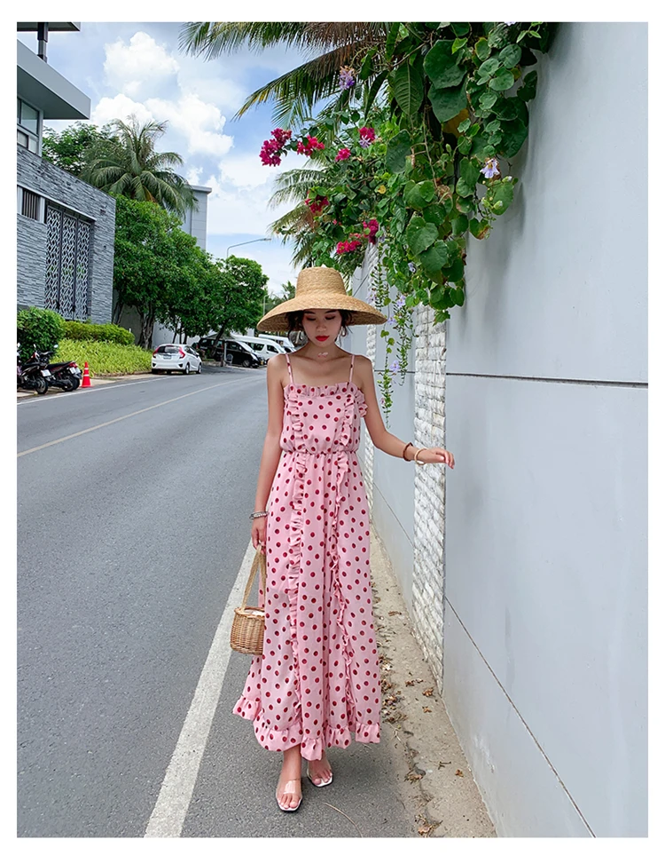 Женское длинное пляжное платье в горошек, элегантное винтажное платье в Корейском стиле с открытой спиной и оборками для отпуска, лето 2019