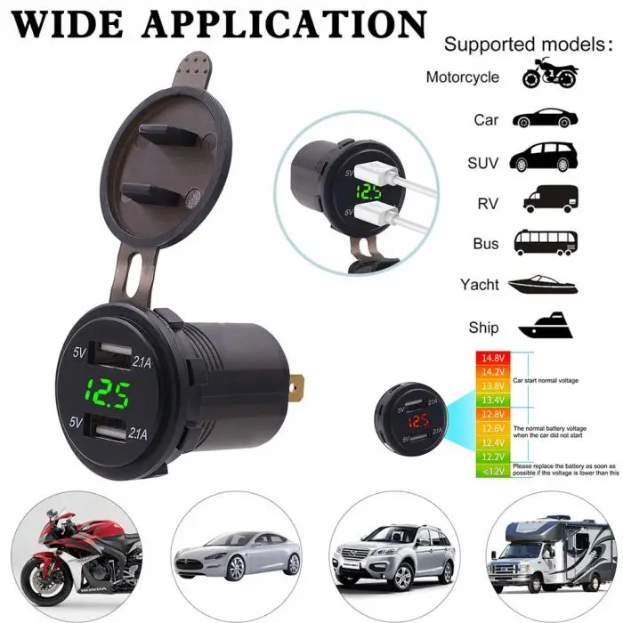 Широкая совместимость:Это зарядное устройство USB подходит для DC 12-24 V автомобиля, лодки, морской, мотоцикл и т. Д.