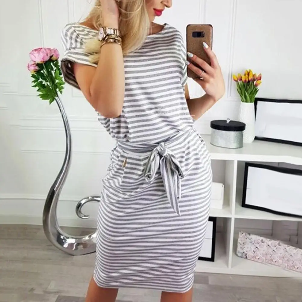 Женское облегающее платье-карандаш с короткими рукавами, Полосатое мини-платье с карманами, вечерние пляжные платья, лето 2019