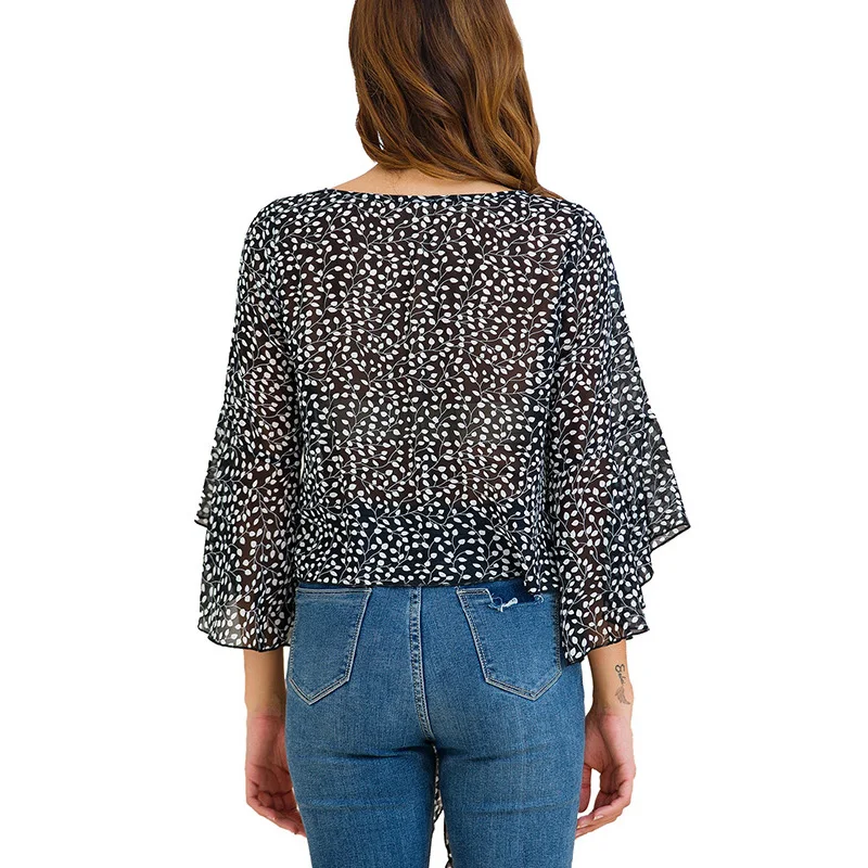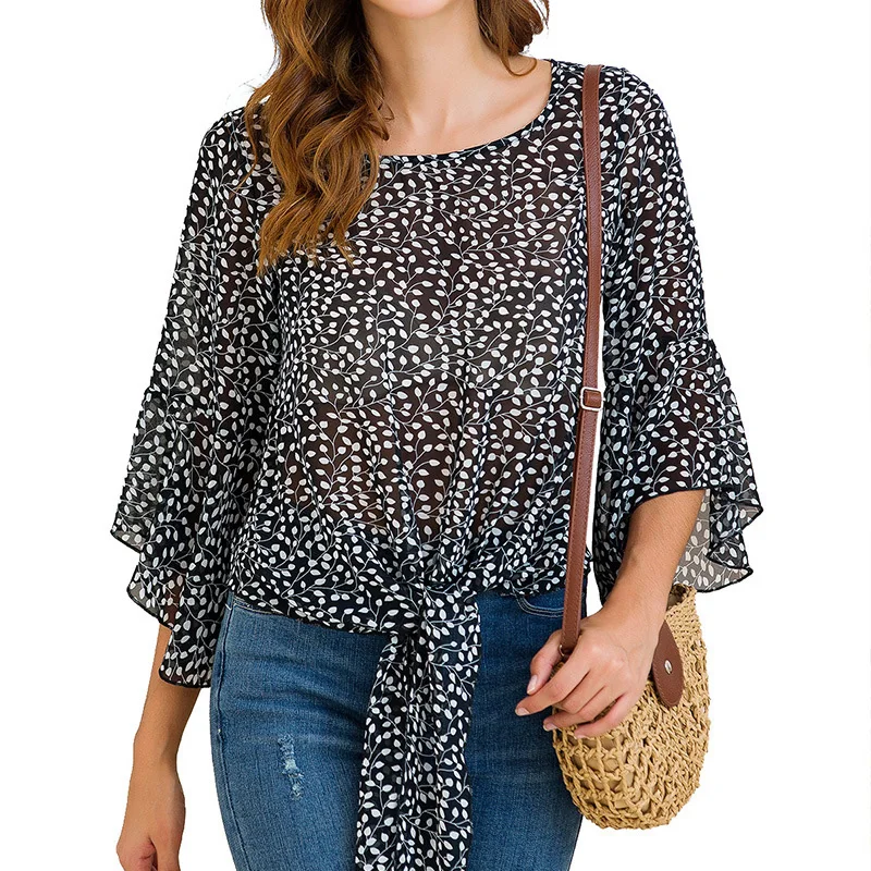 * Описание товара: женская, модная, с принтом листьев, шифон, круглый вырез, свободный рукав в виде листьев лотоса