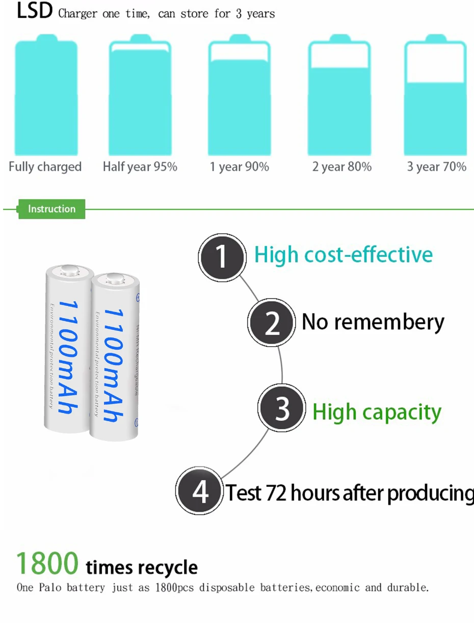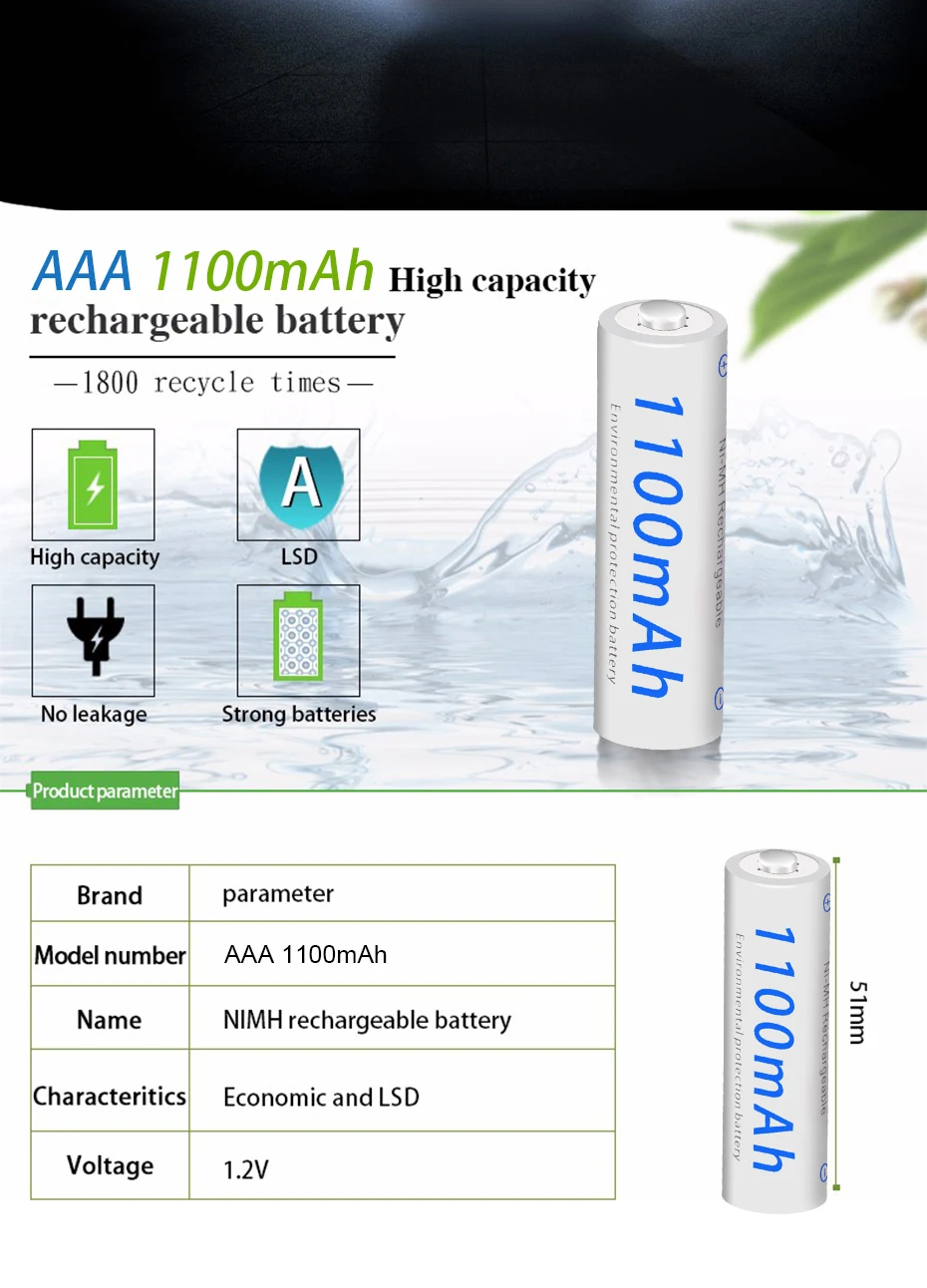 1. Высокая скорость удержания. 2. Сильная способность удерживать напряжение батареи. 3. Низкая скорость потери емкости аккумулятора. 4. Длительный и стабильный Срок службы батареи. 5. Высокая производительность разряда. Применение аккумулятора: 1. Игрушки, цифровые камеры, игровой плеер, MP3/mp4 плеер 2. Фонарик 3. Пульт дистанционного управления 4. Домашний телефон 5. Бытовые электрические приборы 6. Широко используется для нашей повседневной жизни и т. д. Особенности аккумулятора: Тип: никель-металлогидридный низкоразряжающийся аккумулятор Размеры: AAA Размер: Диаметр * Высота = 43(-0,5) мм * 10 м (-1,0) мм Номинальное напряжение: 1,2 V Емкость: 550 мАч + Сертификация: CE, ROHS и т. Д. Цикл перезарядки: 1800 раз