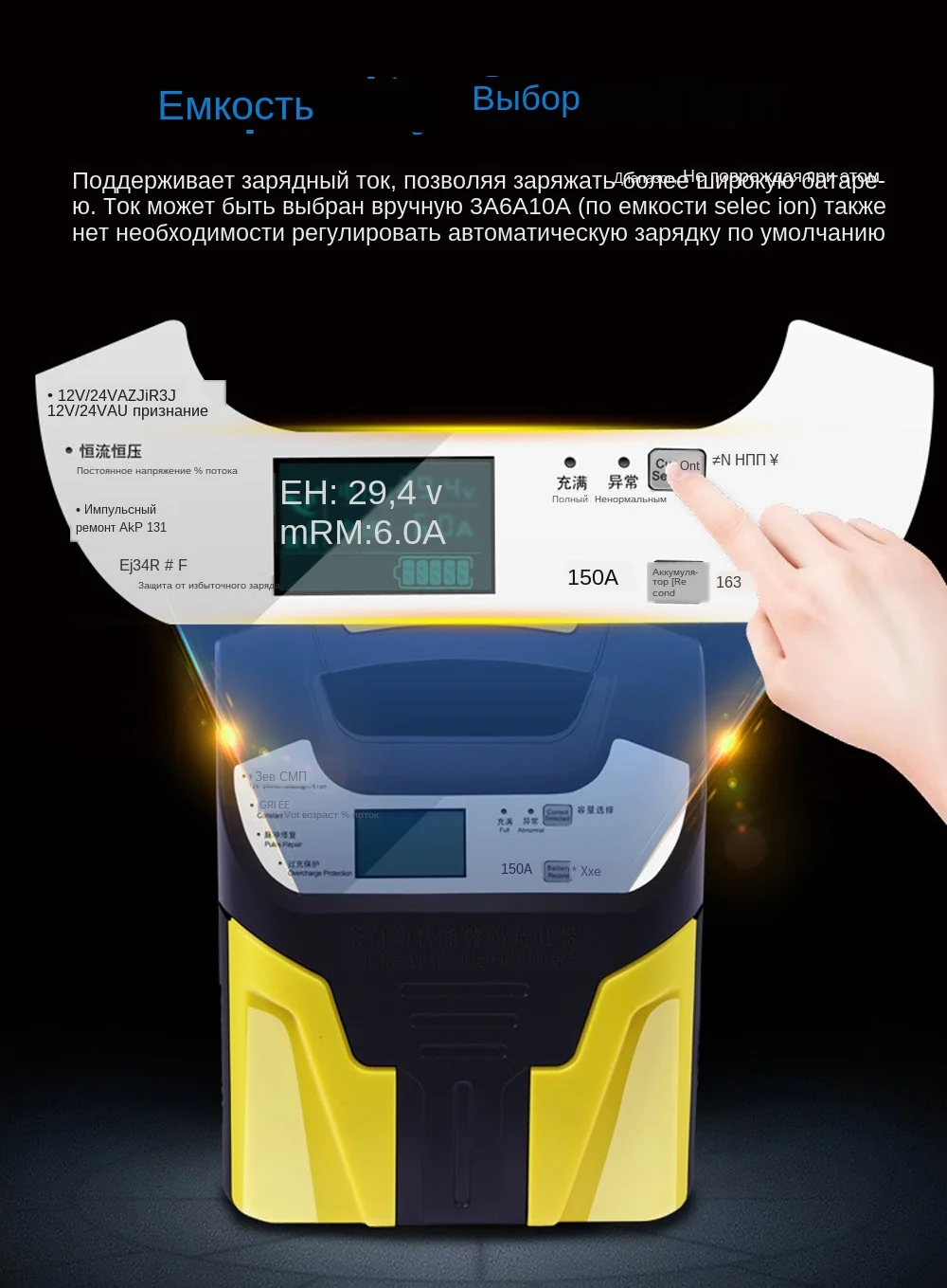 Поддерживает зарядный ток, позволяя заряжать более широкий диапазон, не повреждая аккумулятор. Ток может быть выбран вручную 3A 6A 10A (по емкости Кнопка selecion) Также нет необходимости регулировать автоматическую зарядку по умолчанию