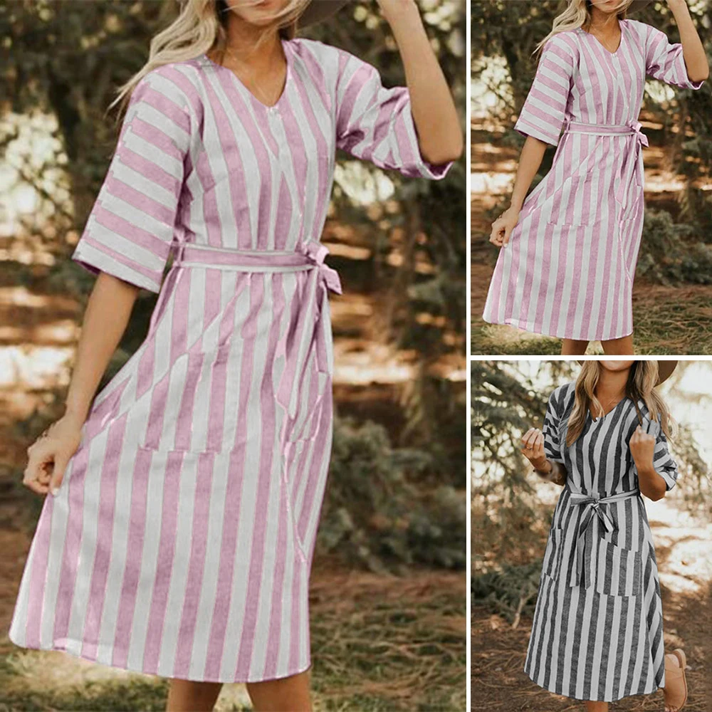* Описание товара:Женская одежда, летнее богемное, в полоску с v-образным вырезом, с карманом, с коротким рукавом, Повседневное платье, плюс размер