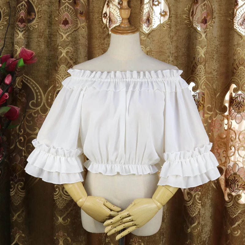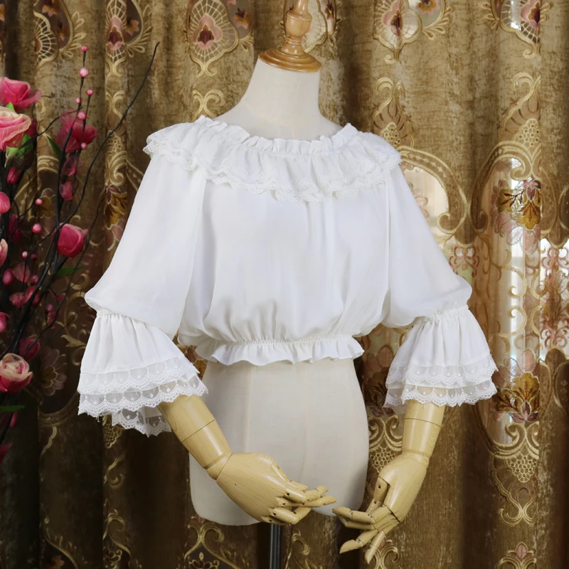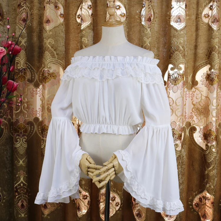 Женский шифоновый топ в стиле Лолиты с длинным Расклешенным рукавом, кружевные белые блузки-кимоно с одним воротником, вечерние блузки, 14 стилей