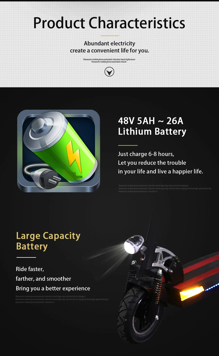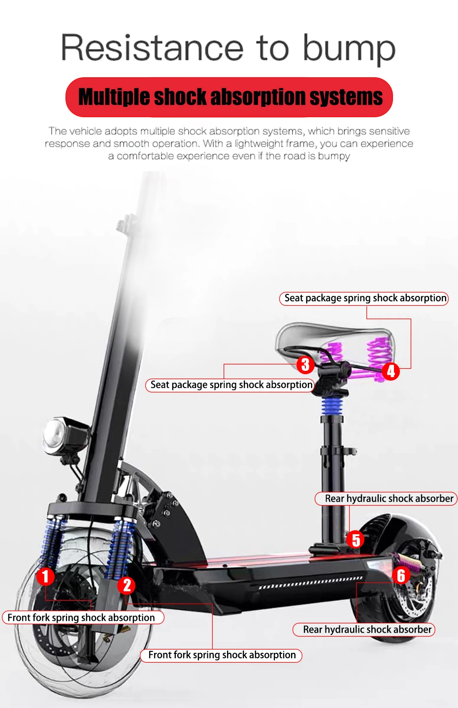 1. Мощный конфигурации: 48V 500 Вт мотор шпинделя, 26Ah 48V литиевая батарея, резина, амортизацией и 10 дюймовые пневматические шины обеспечивают отличное амортизацией и функцией анти-скольжения. 2. Время зарядки около 2-8 часов, а Максимальный ход может достигать 100 миль. Эффективная система демпфирования адаптирует этот электрический скутер, адаптируясь к дорогам разных местностей. 3. Стабильная тормозная система ns: передняя и задняя дисковые тормоза постоянно останавливаются во время аварийного торможения. Передняя вилка изготовлена из высокопрочной углеродистой стали, обеспечивает высокий комфорт и амортизацию. 4. Внешний вид: яркие фары обеспечивают безопасность езды в темноте, съемные сиденья дадут вам различные ощущения от езды, Благодаря механизму быстрого складывания обеспечивается складывание/раскладывание за секунды, что делает его идеальным портативным складным электрическим скутером. 5. Внимание и напоминание: характеристики самоката могут варьироваться в зависимости от веса или дорожного состояния, время работы может варьироваться в зависимости от условий езды, климата и/или надлежащего обслуживания. У Jueshuai есть профессиональная техническая поддержка, если у вас есть какие-либо вопросы или проблемы, отправьте нам сообщение.