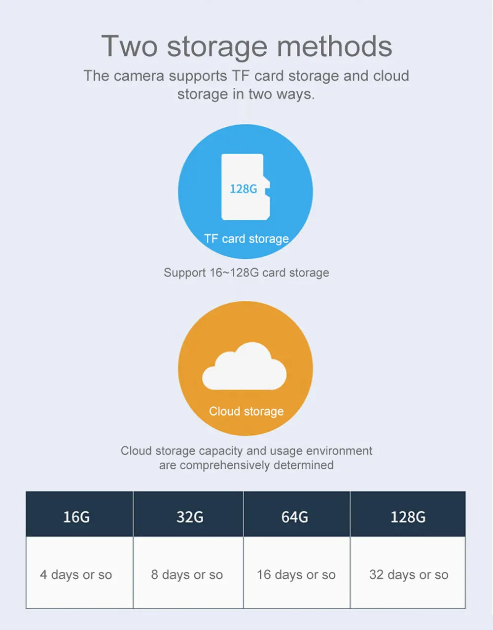 Эта камера имеет Облачное хранилище и обычные возможности хранения карт, не хочу покупать Облачное хранилище, вы можете вставить sd-карту для записи.