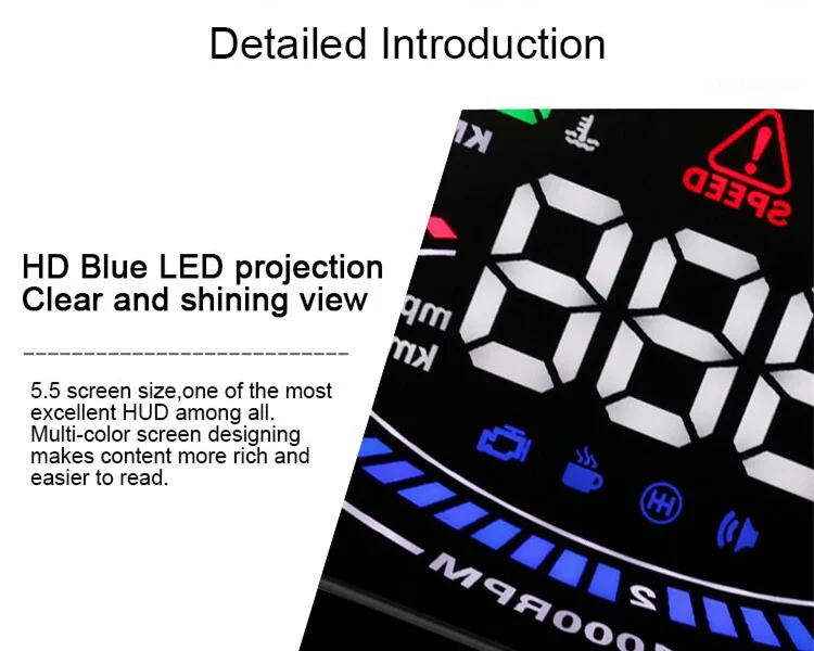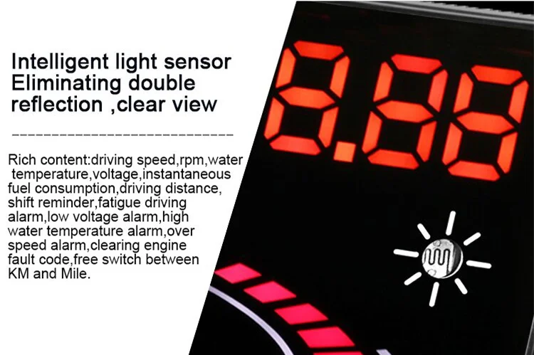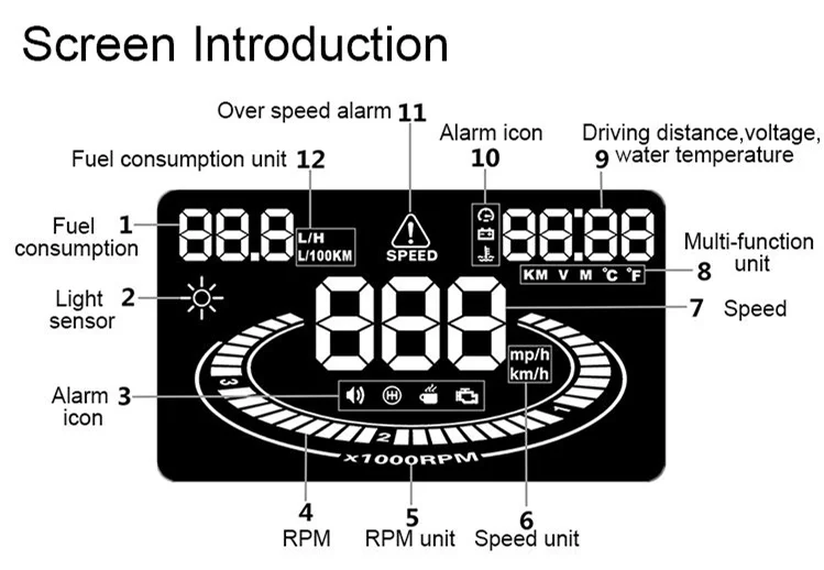 6. Возможность отображения огромного диапазона статистики автомобилей, включая: скорость, скорость вращения двигателя, температуру воды, напряжение батареи, мгновенное потребление топлива, среднее потребление топлива, местное время, время одиночного вождения, измерение пробега, напоминание о смене, напоминание об утомленном драйвере, Сигнализация низкого напряжения, высокотемпературная сигнализация, сигнализация скорости, сигнализация о неисправности двигателя, Устранение кода неисправности, возможность изменения единиц, например, километр/миля