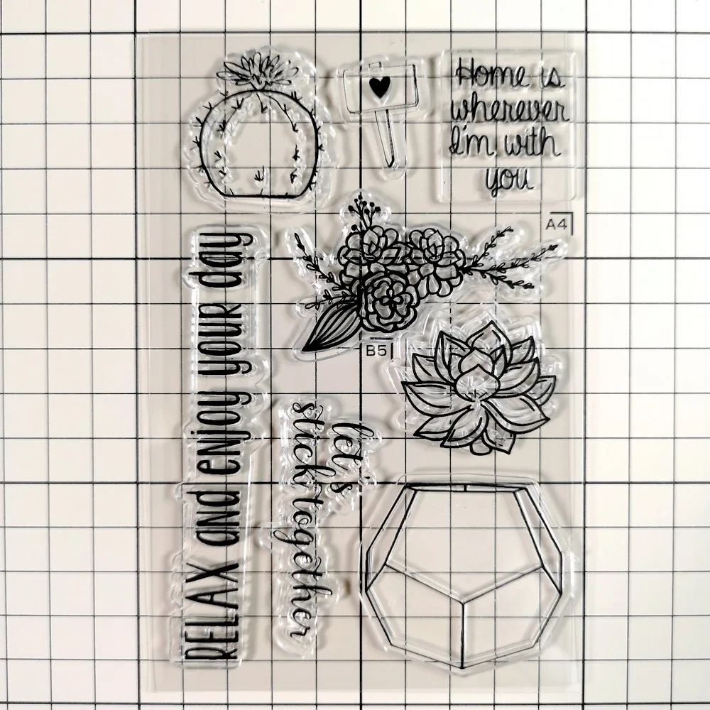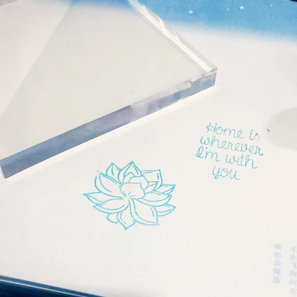 Инструкция по применению 1. Снимите верхний прозрачный лист и снимите штамп, который вы хотите использовать. 2. Нажмите штамп (клейкая сторона вниз) на прозрачный акриловый блок (продается отдельно) для удобства использования. 3. Нанесите чернила на печать и печать на желаемом положении. 4. Штампы многоразовые после чистки, просто поместите обратно на прозрачный лист.