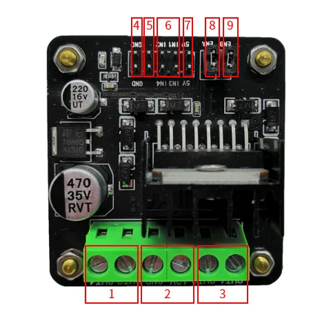Функциональная схема:Модуль обеспечивает 4 входного сигнала или 6 вход MCU сигнала, с Корпус перемычки гибкий выбор. Он поддерживает PWM регулирование скорости и 3,3 V MCU входного сигнала.
