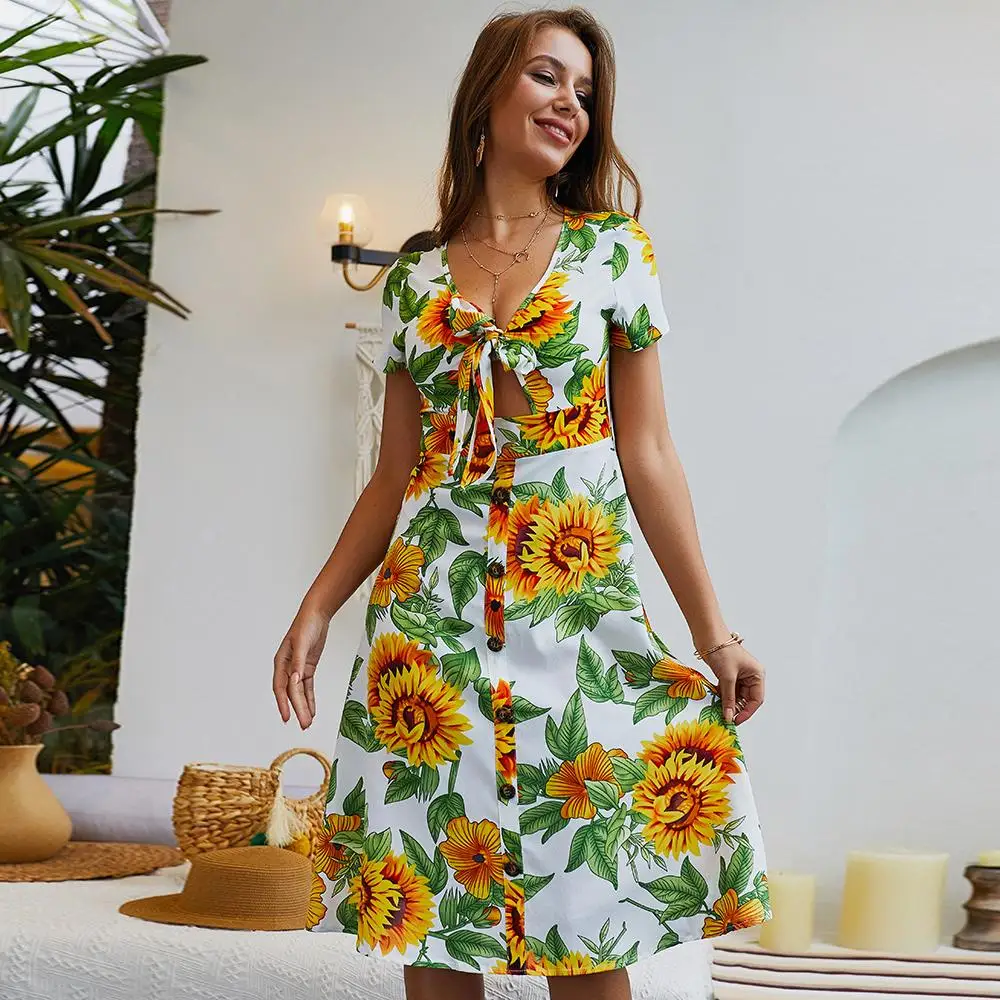 * Описание товара: женское Летнее цветочное кружевное сексуальное мини-платье с v-образным вырезом и подсолнухом
