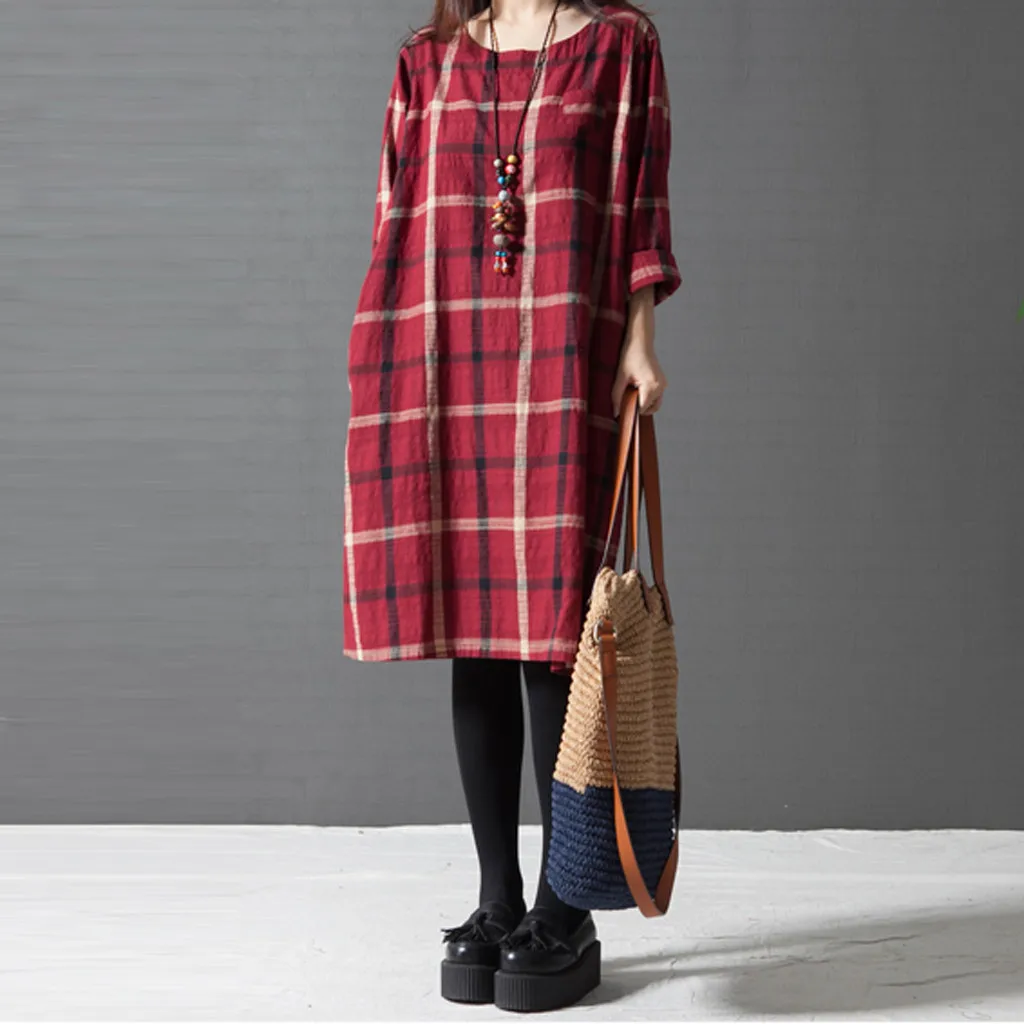 Хлопковое льняное свободное платье в стиле ретро с длинными рукавами и круглым вырезом; большие размеры