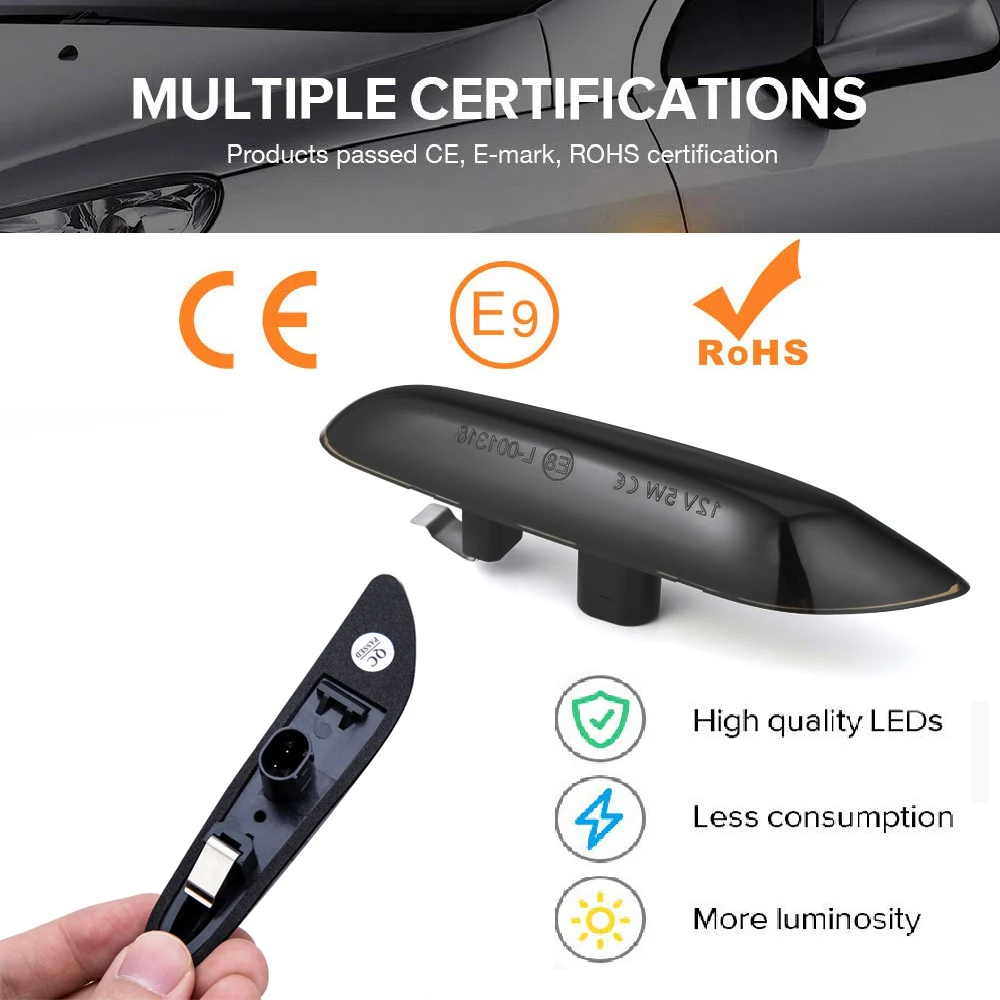 -Каждый светильник имеет 18 высококачественных янтарных светодиодных чипов Премиум-качества, в 3 раза ярче, чем в наличии боковые маркеры для ламп накаливания. -Специальная последовательная мигающая конструкция для поворотного сигнала -С монтажной прокладкой, устойчивой к тряске и плотно установленной на транспортных средств -Ниже расход энергии, экономит всю энергию -Разъем для лампы Plug & Play, светильник OEM #:63137253325,63137253326, 63133403613...