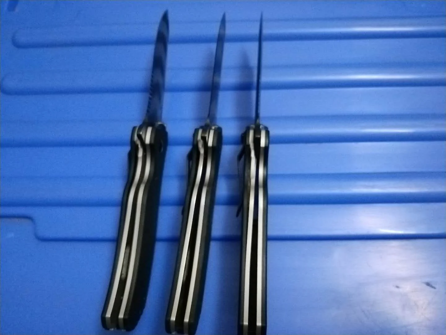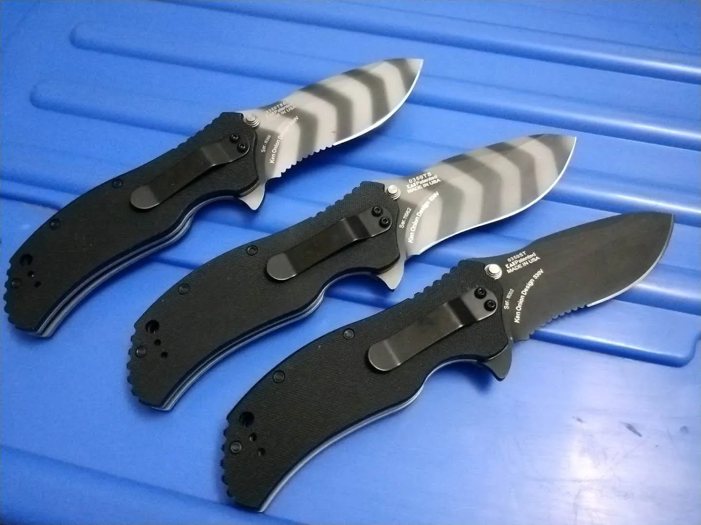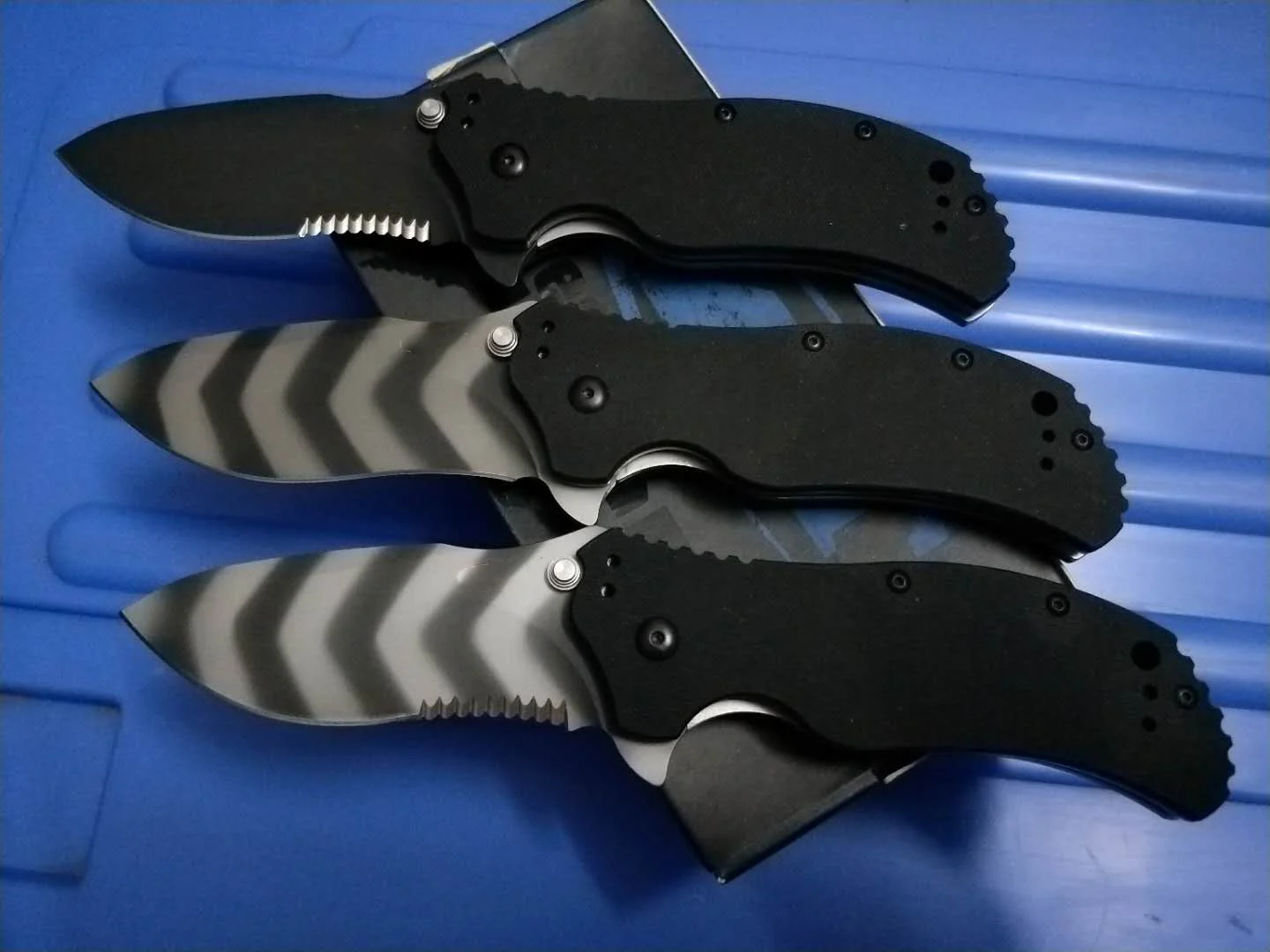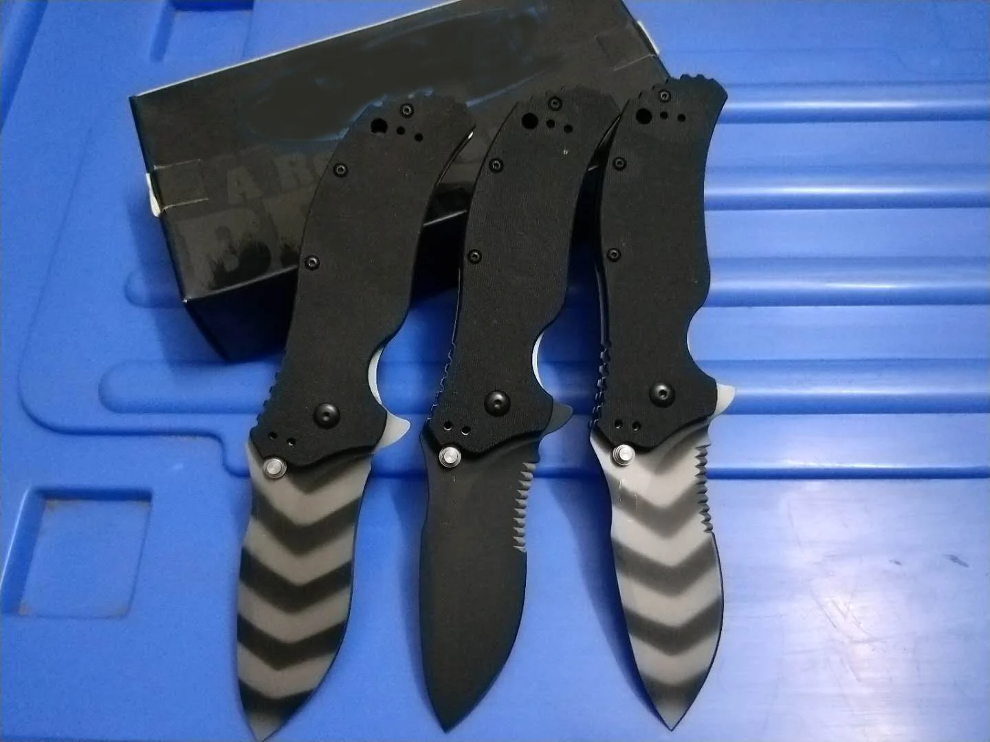 Лезвия обрабатываются отдельно: черный, тигровый камуфляж, наполовину зубчатый и тигровый камуфляж.