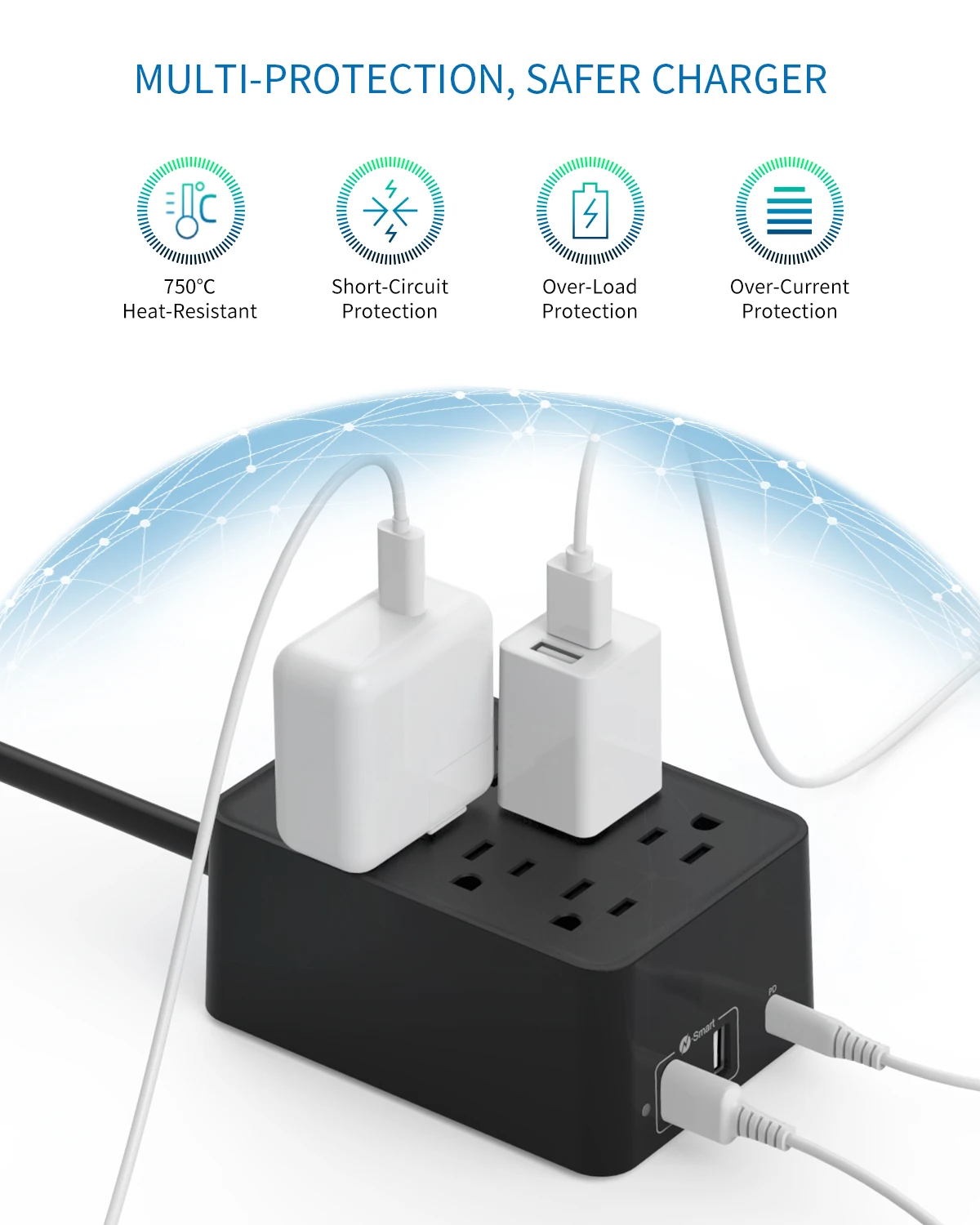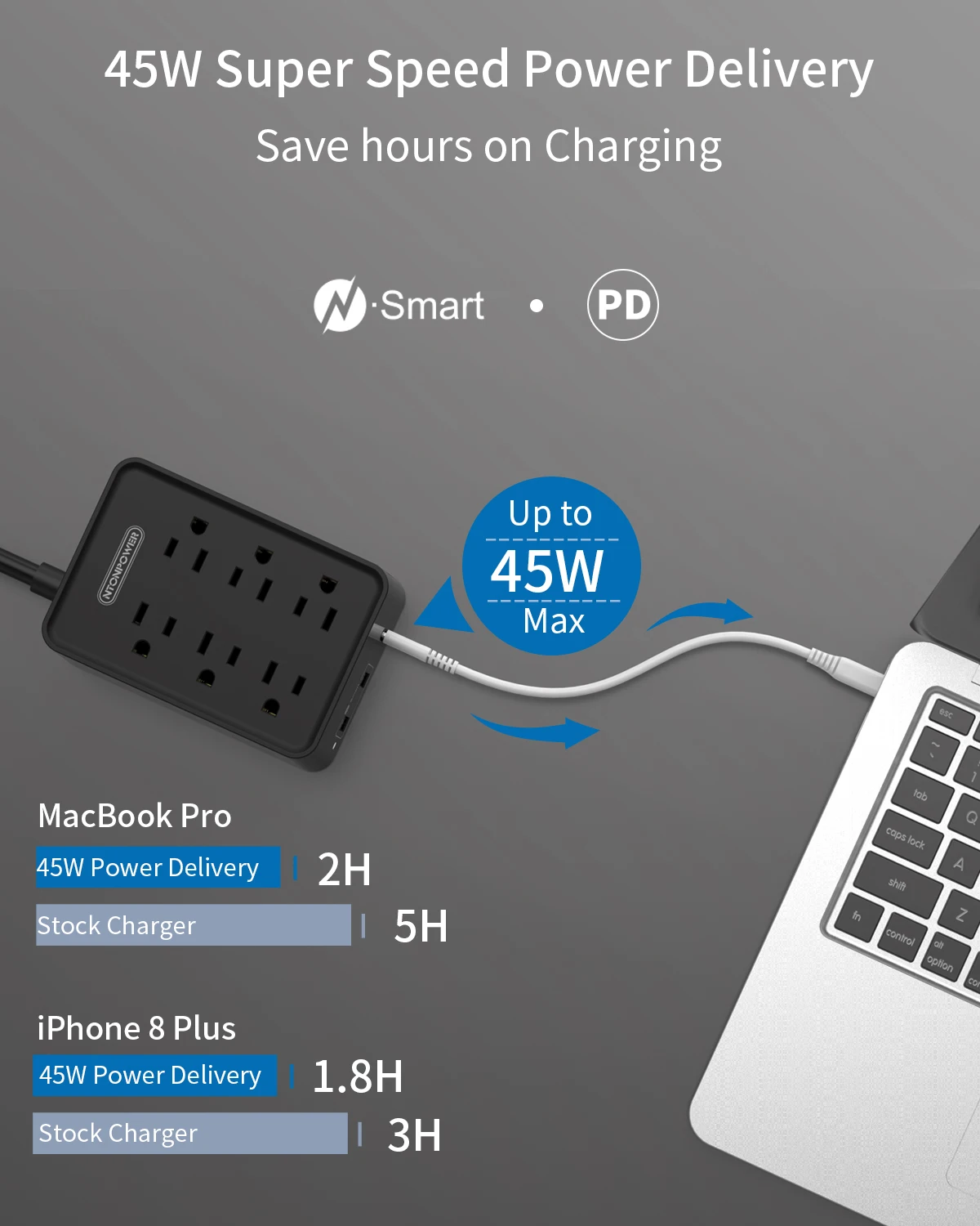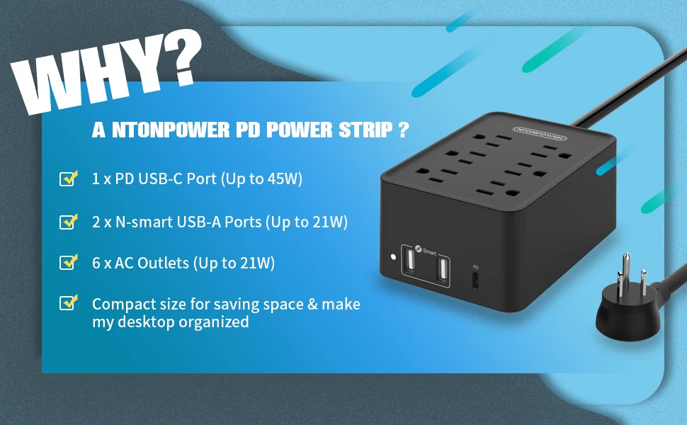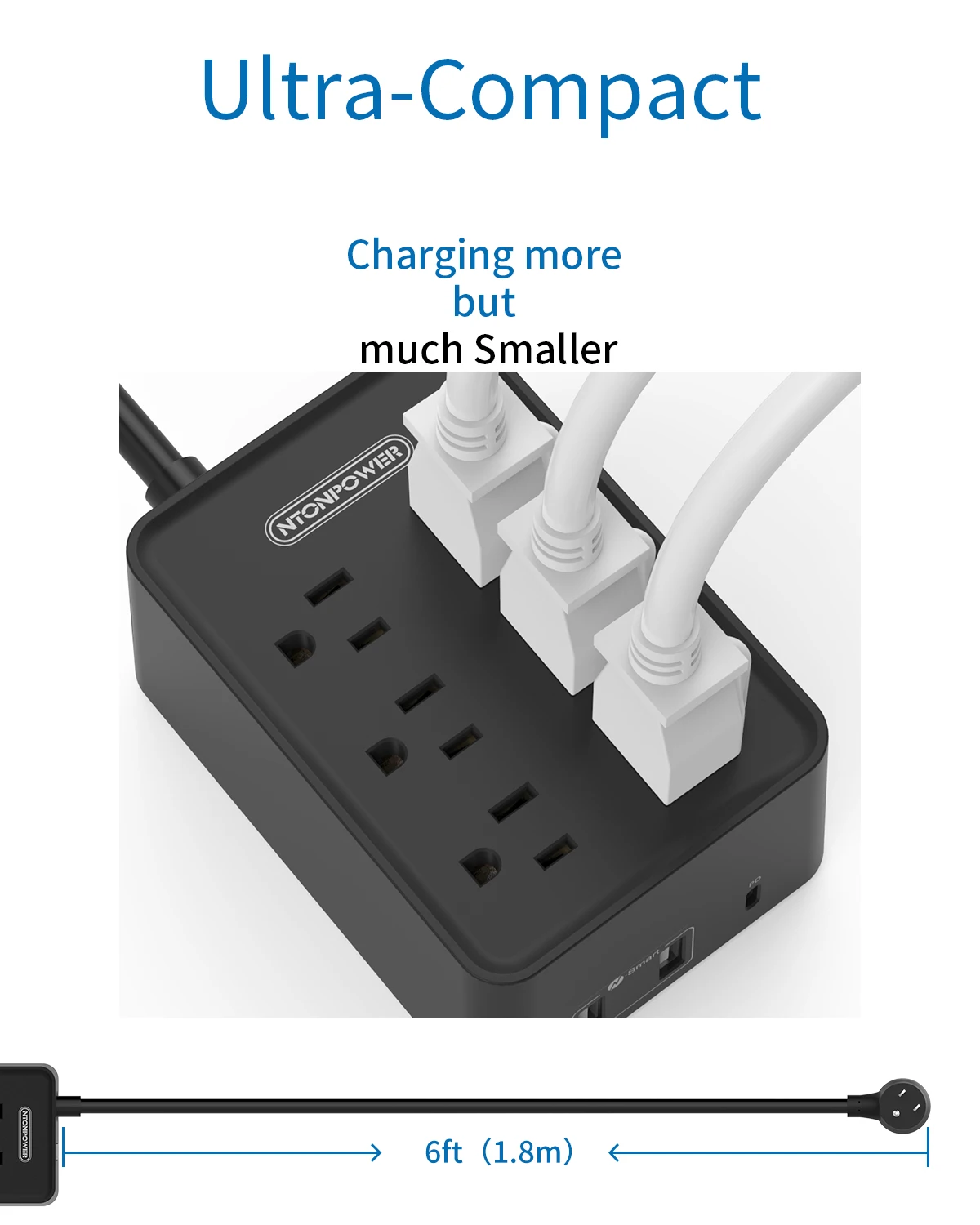 1. 6 розеток переменного тока и 3 порта USB для зарядки: этот блок питания позволяет заряжать до 9 электрических устройств одновременно, таких как смартфон, планшет, банк питания, bluetooth-динамик, usb-портативный вентилятор, И т. д. 2. 45 Вт высокая скорость доставки: Зарядка USB-C ноутбуков и планшетов на высокой скорости. 3. Тонкий и портативный: компактный корпус очень легко носить с собой, экономит место вашего чемодана, когда вы путешествуете 4. Мульти-система защиты: огнеупорный ABS + PC материал и внутренняя система безопасности обеспечивают полную защиту ваших устройств от электрического короткого замыкания, перегрева, перезарядки, перегрузки по току и перенапряжения 5. Гарантия: NTONPOWER power strip предлагает 18 месяцев гарантии с даты размещения заказа. Поэтому, если вам нужна помощь, пожалуйста, не обращайтесь к нам.