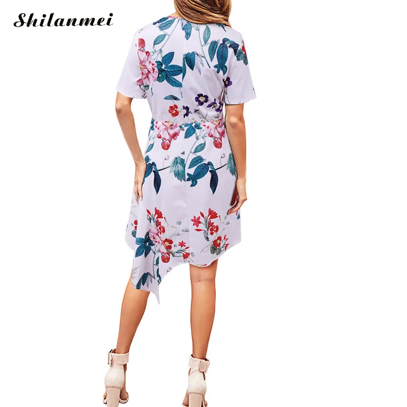 Женское асимметричное платье средней длины с цветочным принтом, облегающее платье с коротким рукавом, весна-лето 2019