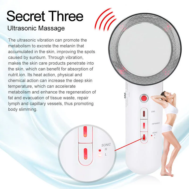 Инструкция различных функций: 1. Инфракрасная функция Инфракрасные лучи могут проникать в глубину кожи и подкожных тканей. Длина волны, созданная очень близка к частоте вибрации молекулярных клеток тела, через резонансное поглощение, трение между молекулами генерирует тепло, тем самым увеличивая температуру глубоких подкожных тканей и ускоряя циркуляцию крови. В результате, он может очистить отходы в кровеносных сосудов, устранить повреждения тела и активировать histiocytes для предотвращения старения. Поэтому инфракрасные лучи могут иметь эффект предотвращения и лечения различных заболеваний, вызванных плохой циркуляцией крови и микроциркуляцией. Также используется для лечения артрита и аномального обмена веществ. 2. EMS Принимает принцип, что он будет потреблять жир, когда мышцы вибрируются, и принимает периодическую изменения тока, Используя мощную терапию многократно для достижения эффекта потери веса, массажа и расслабления. Когда мышцы волнуются низкочастотным током, это вызывает мышечную вибрацию в пределах некоторой амплитуды. Движение мышц, которое не контролируется волей, называется пассивным движением. Когда это движение возникает в теле, более активное сжигание энергии в теле. В таких условиях количество расходуемого кислорода и выделяемого углекислого газа и воды может увеличиваться в десятки раз. При нормальном перемещении мышцы могут потреблять 60-70 джоулей в секунду, но при высокой частоте движения мышцы могут потреблять 3000-4000joule в секунду. 3. Ультразвуковой массаж Ультразвуковая вибрация может продвигать обмен веществ, выделяя меланин, который накопился в коже, улучшая пятна, вызванные солнечными ожогами. Благодаря вибрации средства по уходу за кожей проникнут в кожу, что обеспечивает поглощение питания. Его тепловое воздействие, физическое и химическое воздействие может повысить глубокие температуры кожи, что может ускорить обмен веществ и улучшить регенерацию жира и удаление отходов тканей, ремонт лимфы и капиллярных сосудов, таким образом, способствует похудению тела. Параметры: Тип изделия: ультразвуковой массажер для тела Материал: АБС-пластик Цвет изделия: как на фото Штепсельная Вилка: штепсельная вилка австралийского стандарта, штепсельная вилка британского стандарта (опционально) Напряжение: 100-240 В Размер изделия: как показано на фото Вес посылка: прибл. 654 г/23,1 унций Посылка включает в себя: 1 * Основная машина 1 * адаптер 1 * кабель 4 * электродные прокладки 1 * руководство на английском языке
