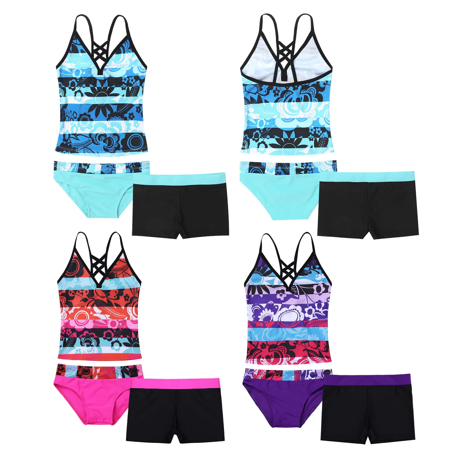 Бретельки-спагетти, топы для плавания с цветочным рисунком, перекрещивающимися и вырезами сзади. Только бирка от 12 до 16 имеет несъемные накладки на грудь.