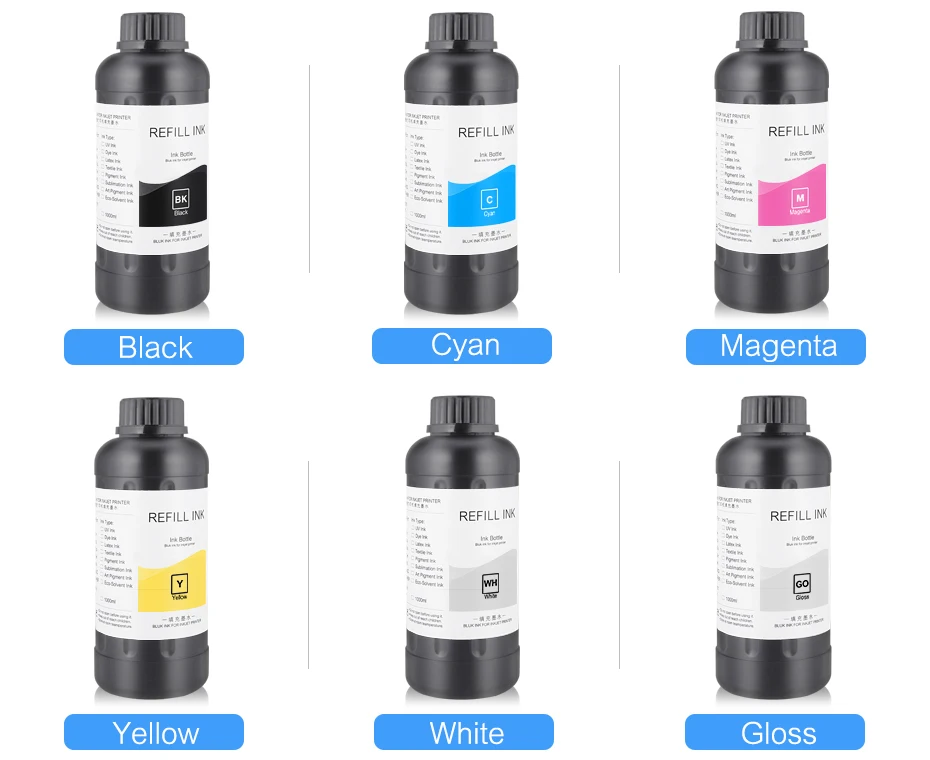 1 бутылка 500 мл Черные УФ чернила 1 бутылка 500 мл голубой УФ чернила 1 бутылка 500 мл пурпурный УФ-чернила 1 бутылка 500 мл желтые УФ чернила 1 бутылка 500 мл белые УФ чернила 1 бутылка 500 мл блеск УФ чернила Примечание: Если вы не хотите покупать полный набор чернил, пожалуйста, обратите внимание на цвет, который вам нужен при размещении заказа. Когда мы получим ваш заказ, мы вышлем вам нужный цвет.