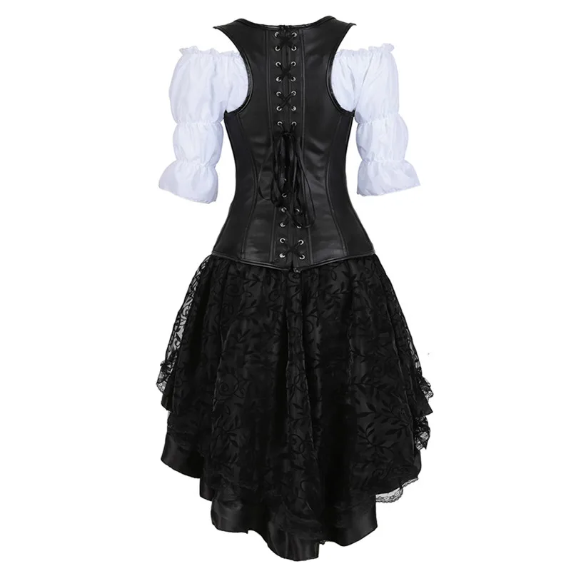 Стимпанк корсет платье для женщин из трех частей кожаный корсет с юбкой и Ренессанс рубашка Готический Пиратский костюм размера плюс черный